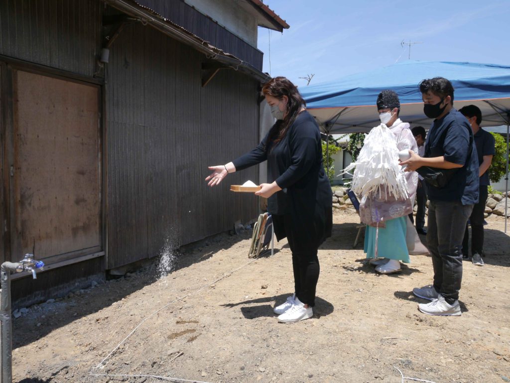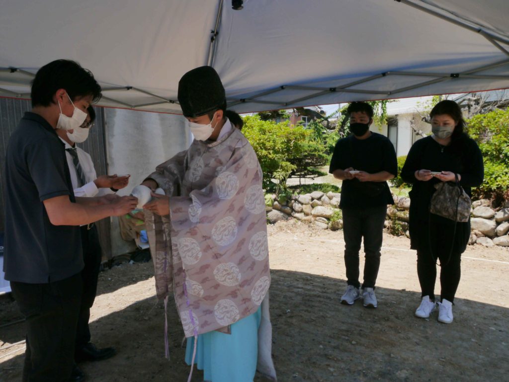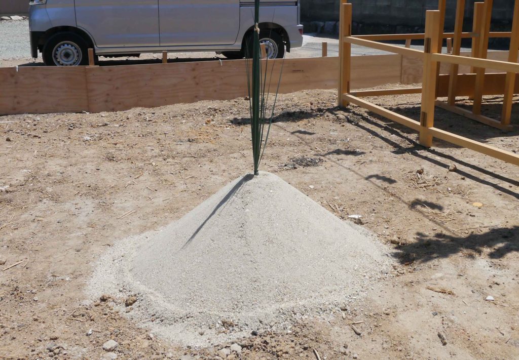 敷地の四隅にお神酒、お塩を撒いて祓い清めます(#^^#)