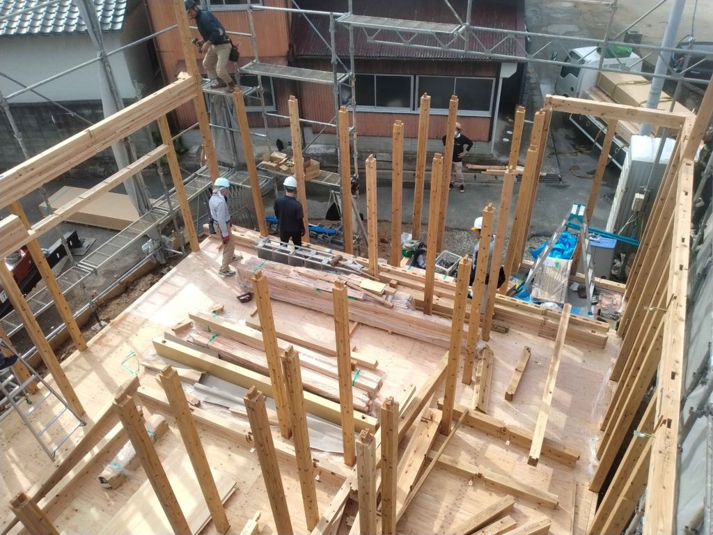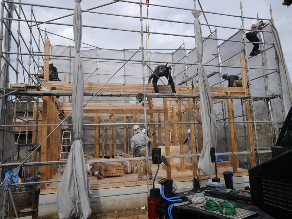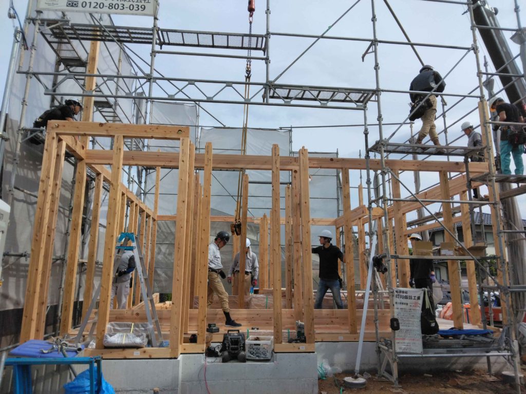 前日までに1階の床板施工まで終わっているので、1階の柱を立てるところから始まります!
