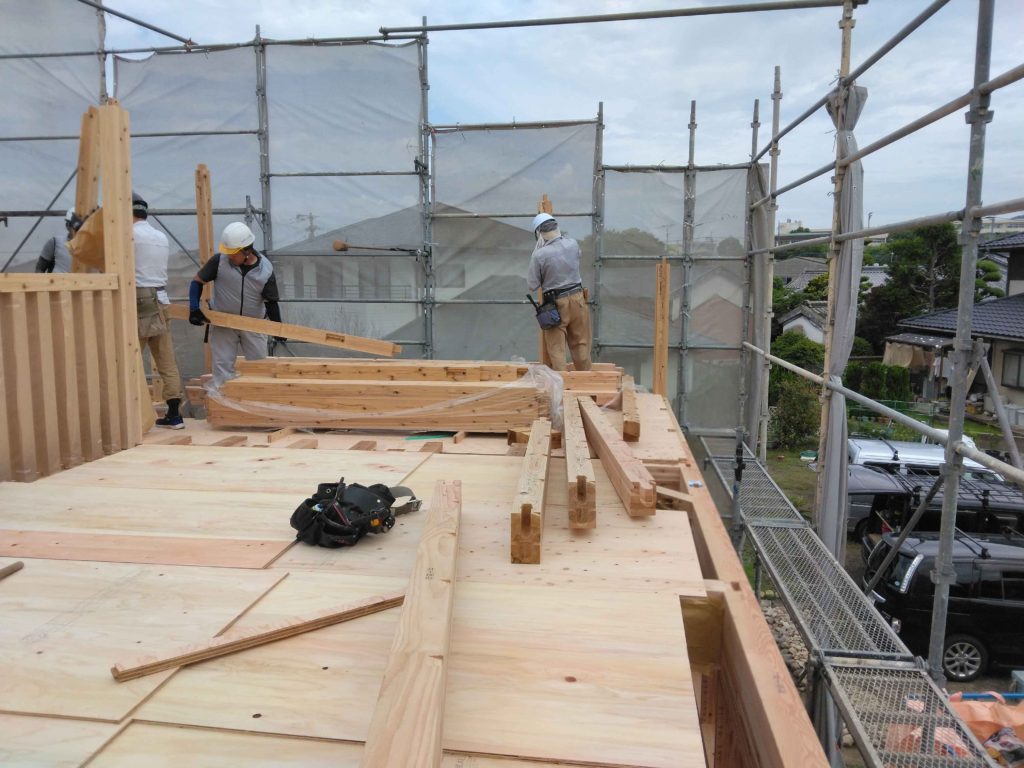 屋根に垂木を設置する作業を行い・・・