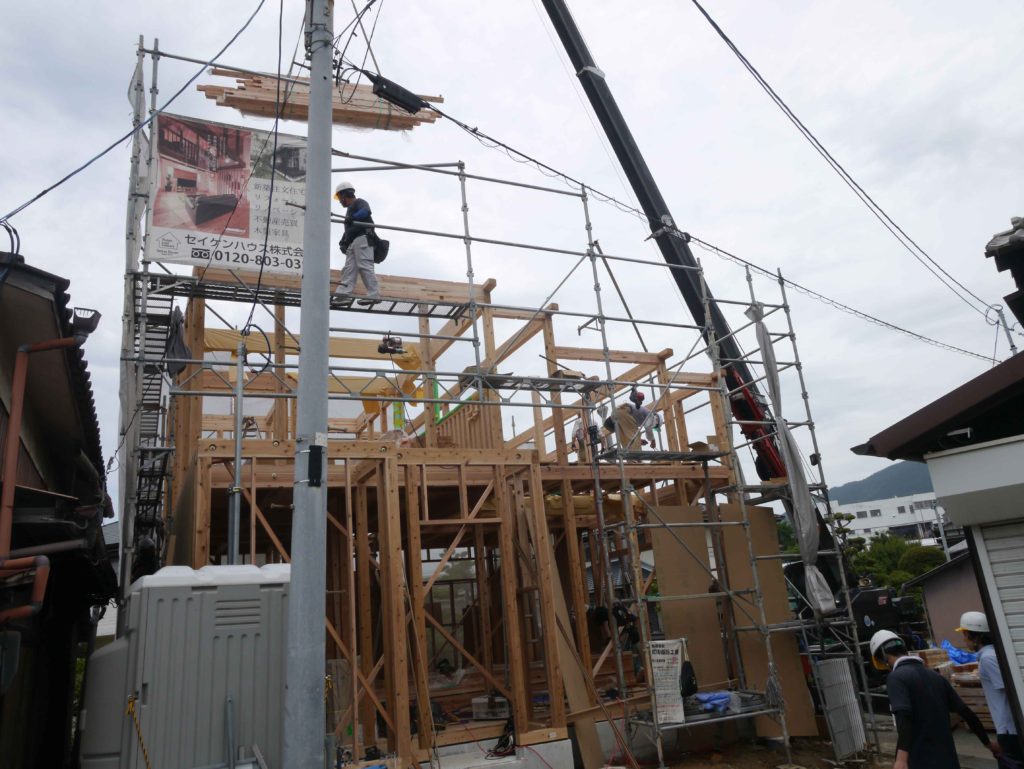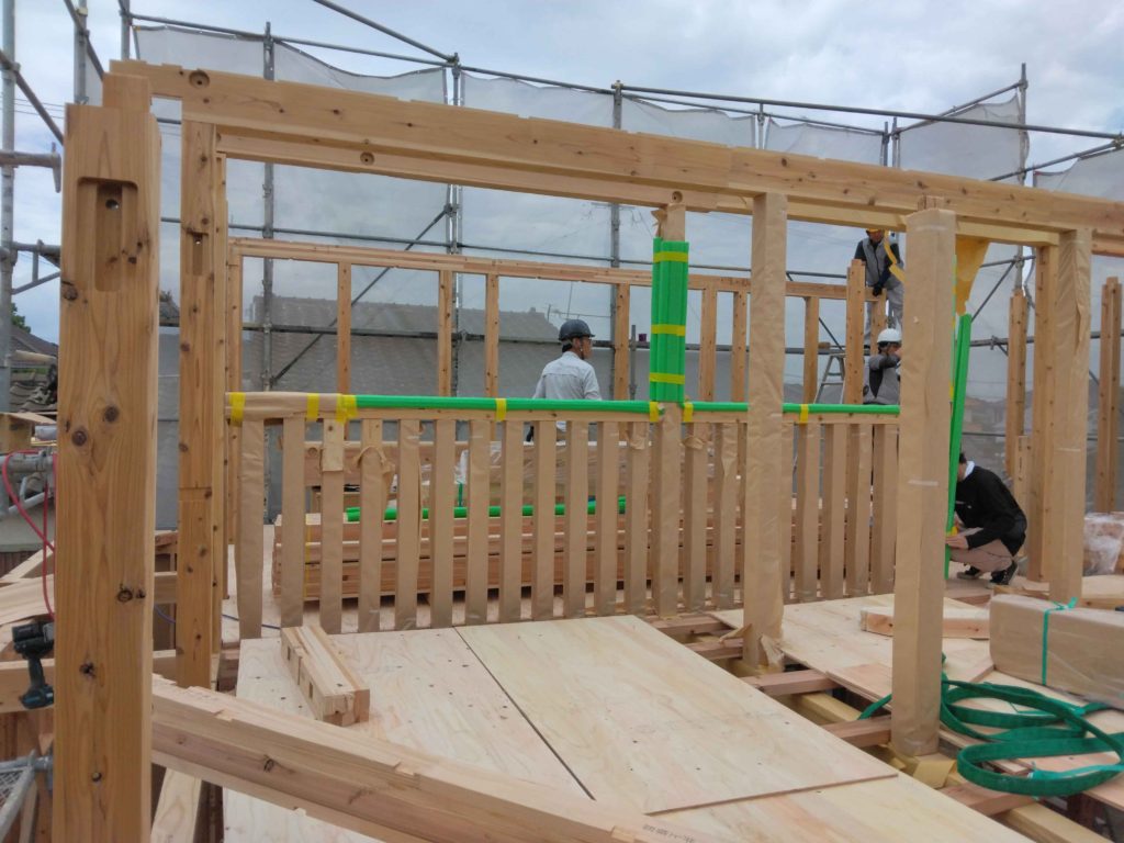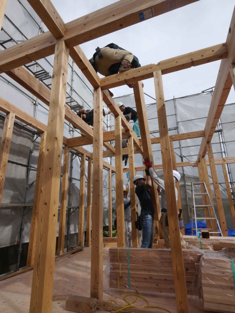 1階の柱を立てると、梁などの横架材を組んでいきます!
