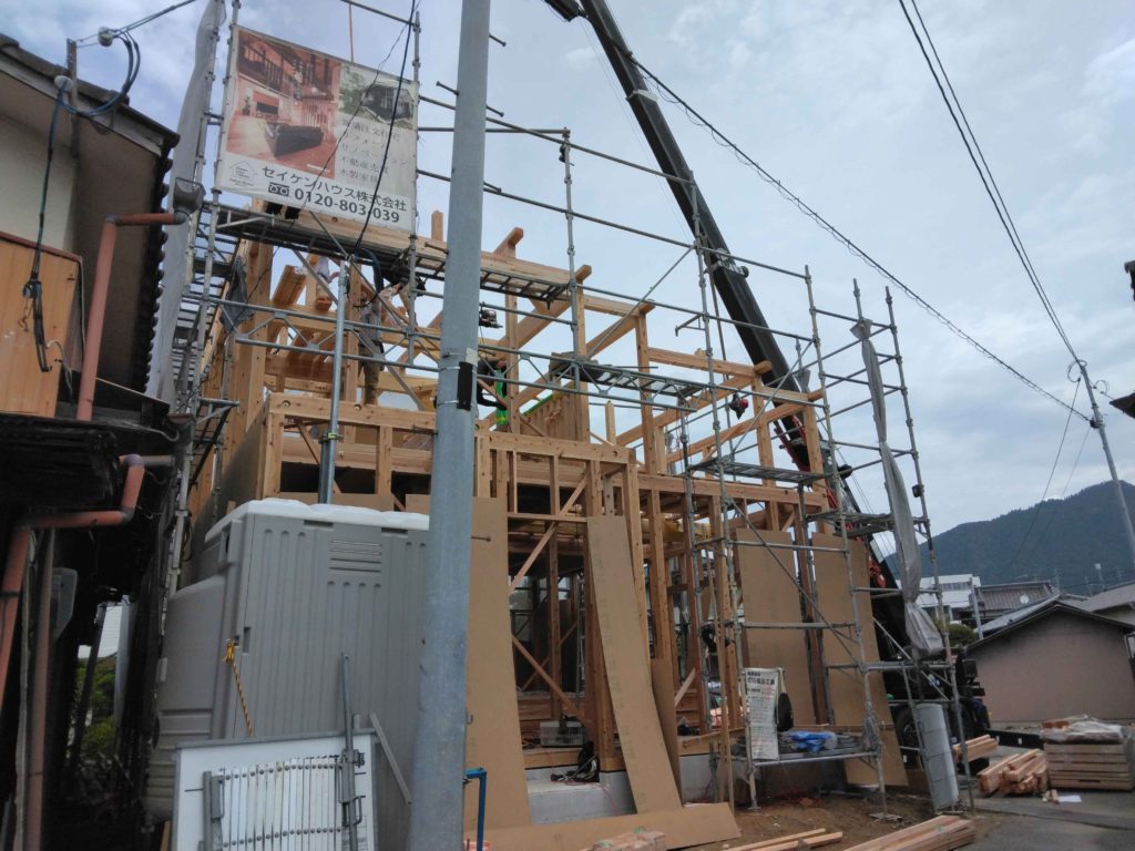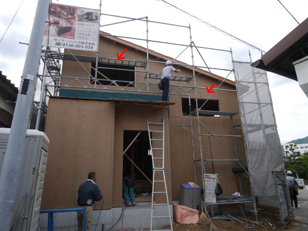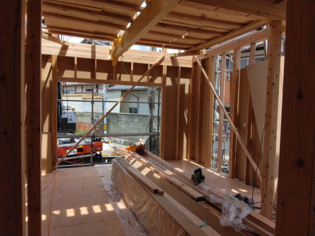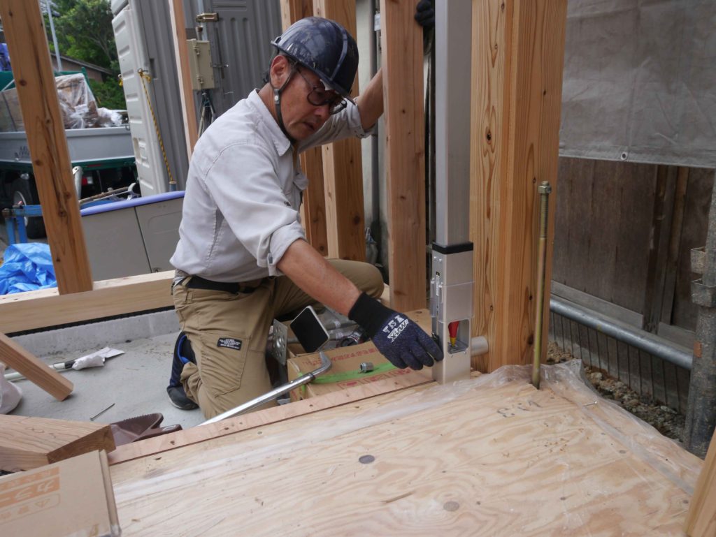 そして、柱と梁を組んだあとは、仮筋交いを取り付けます!