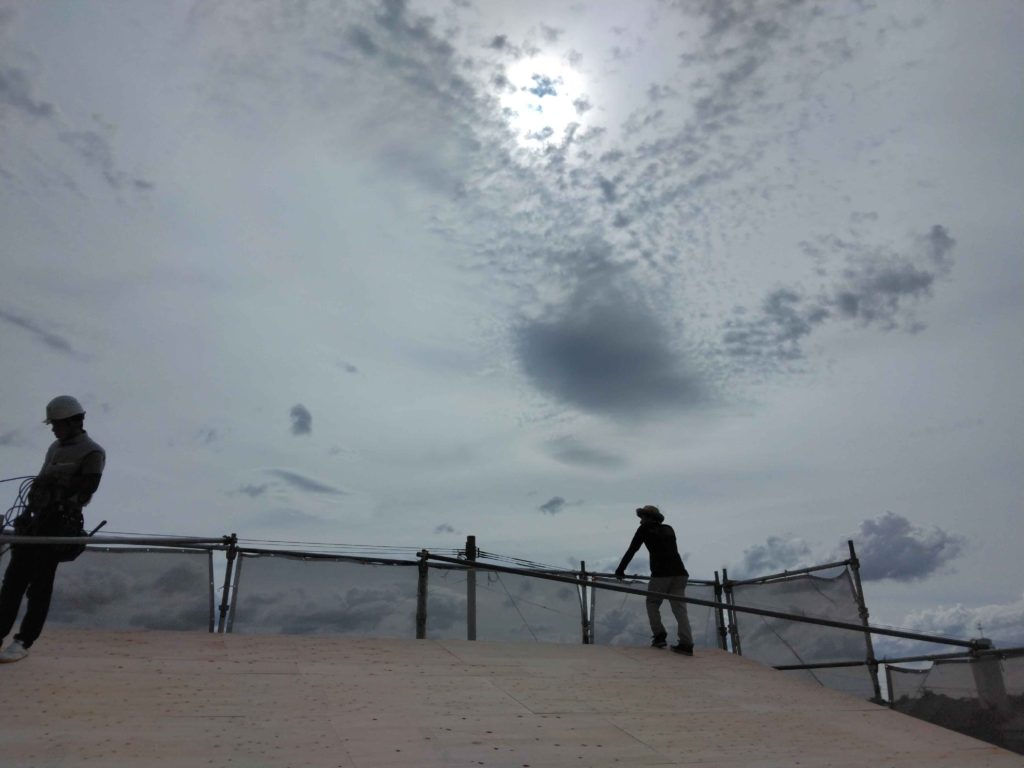 屋根全体を覆ったら、棟上げ完了です!