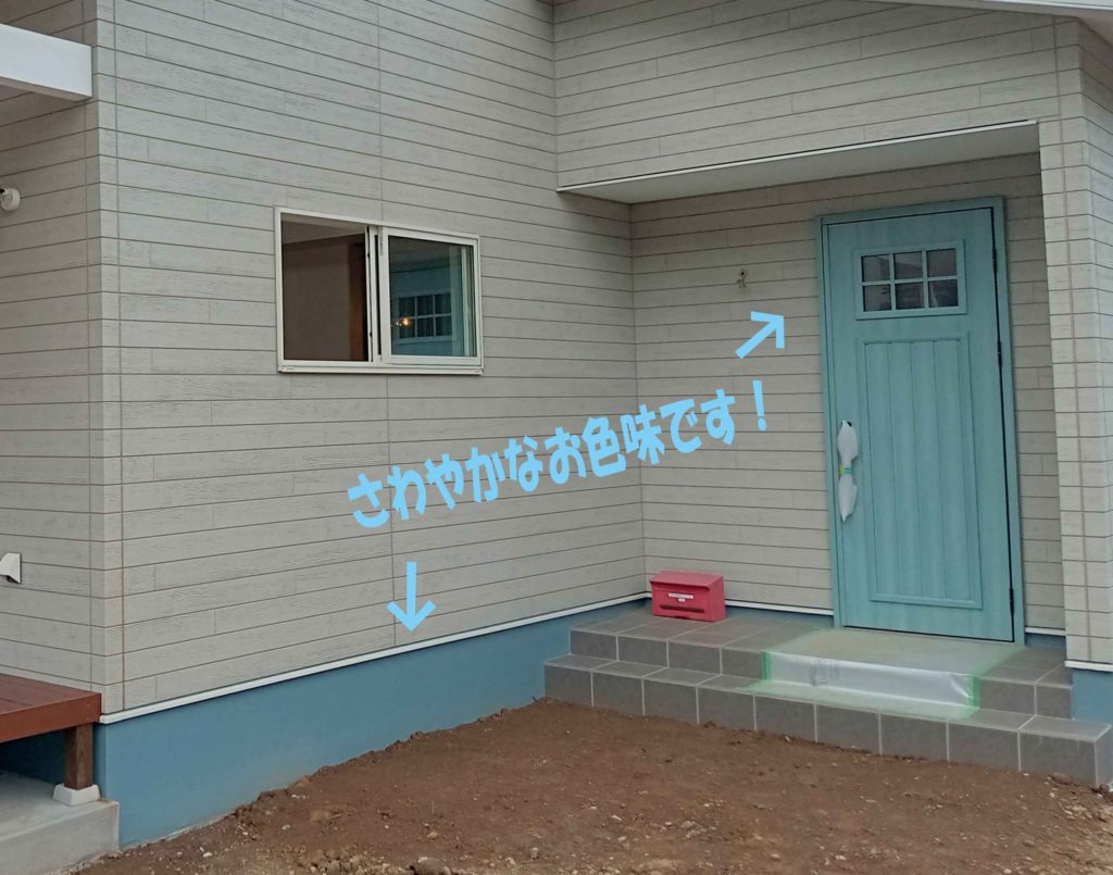基礎と玄関ドアのお色味が統一されていて、さわやかな印象の外観♥