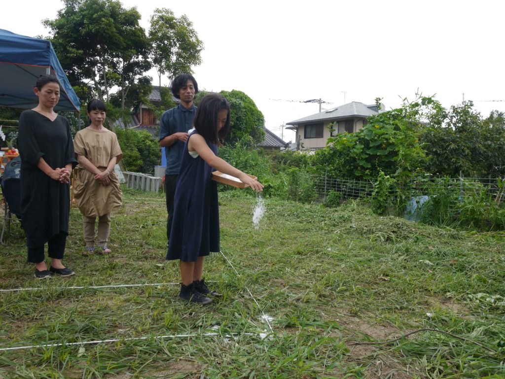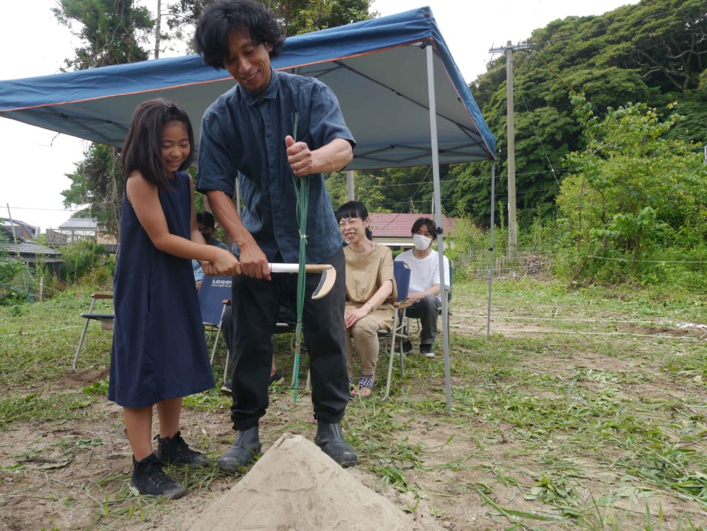 鎌で土地の草を刈り取り、工事が始まることを伝えます(^^♪