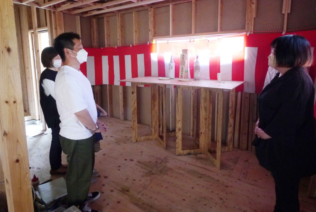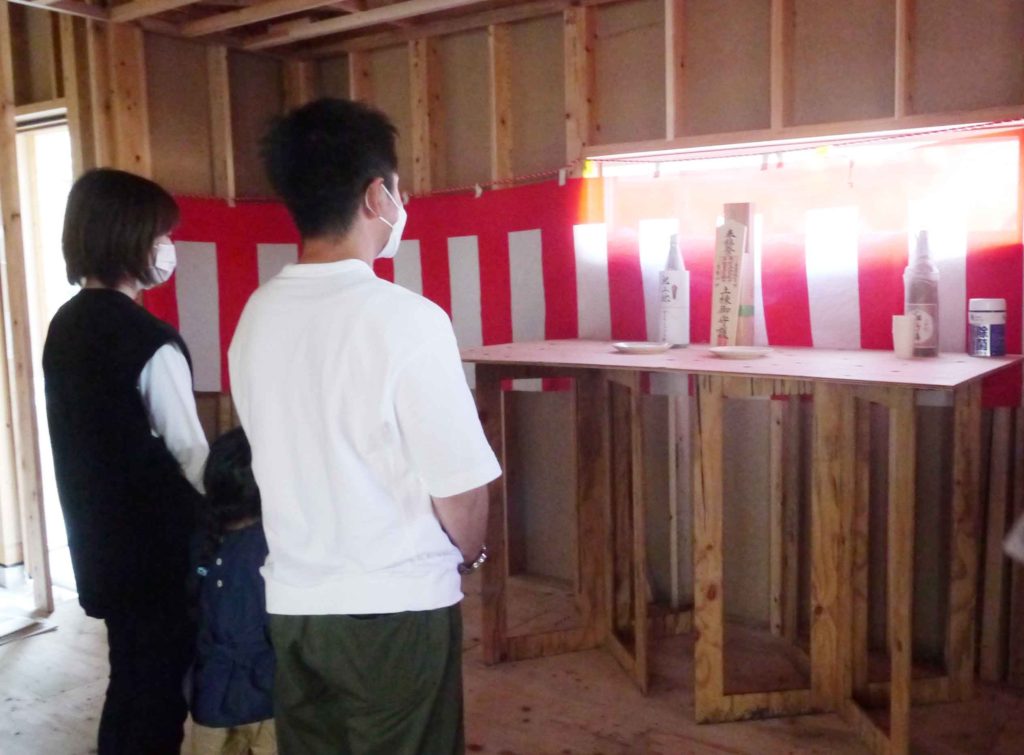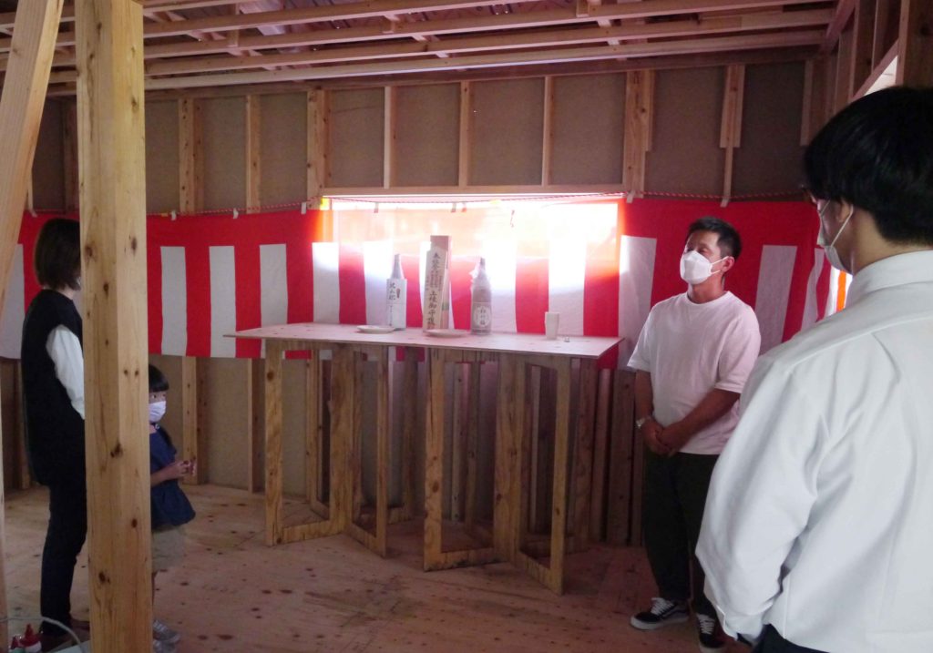 また、上棟式では天地四方の神様を拝むため、四隅の柱に酒、塩、米を撒いていきます!