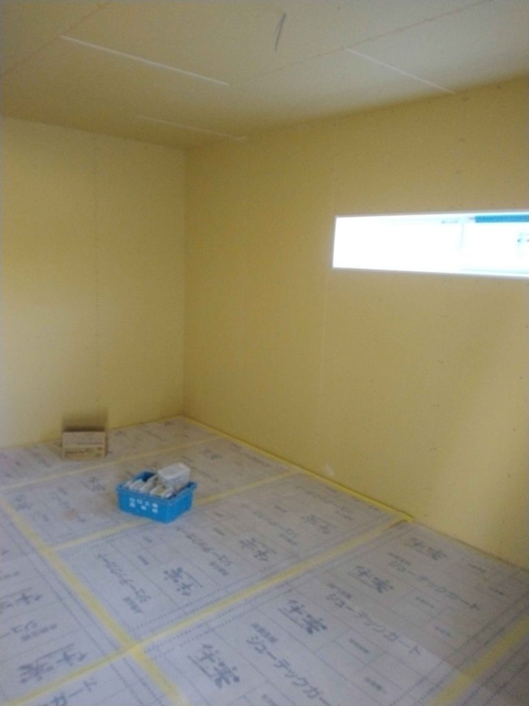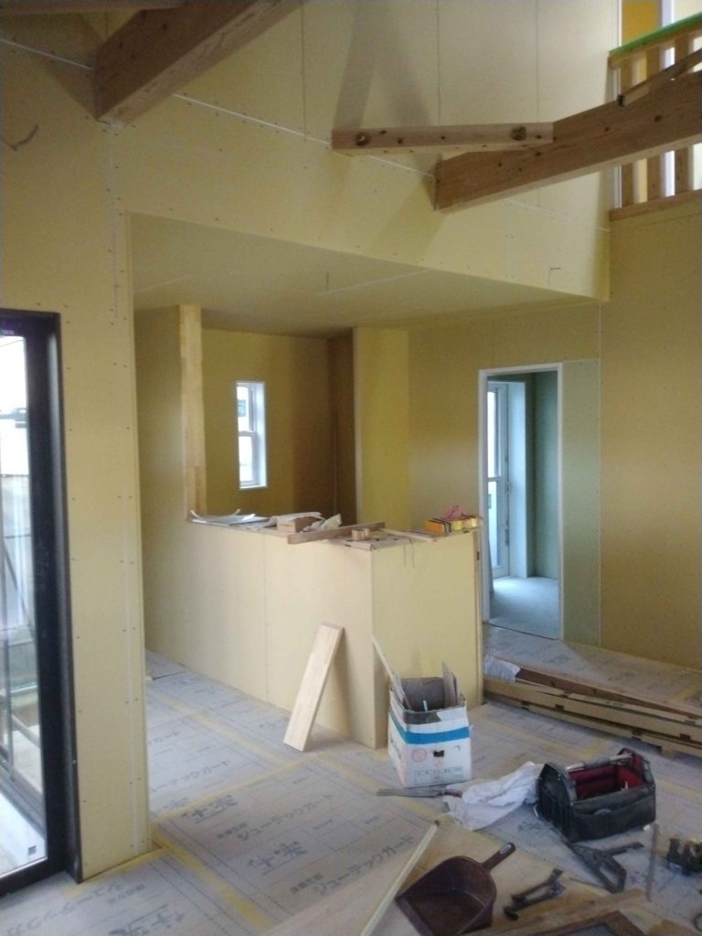ボードを打ち付けた後の凹凸をパテで均一に均したら、クロス工事に入ります!