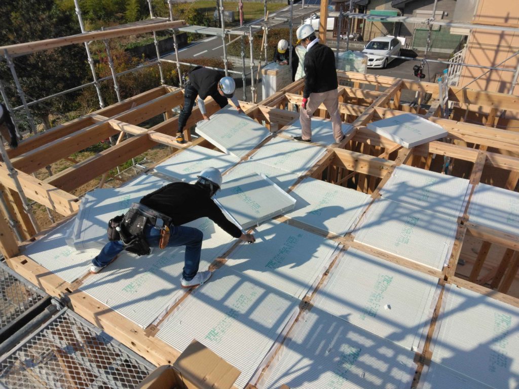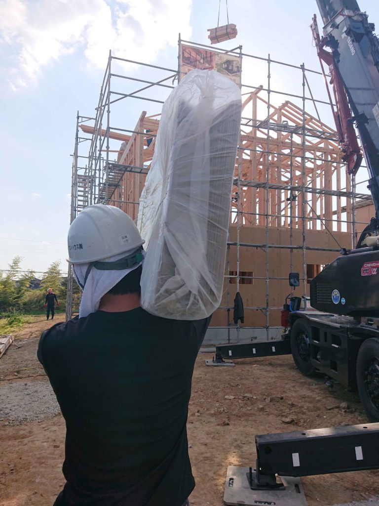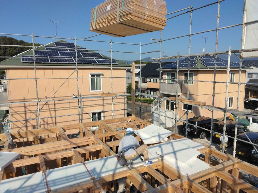 梁の設置が終わると、今度は2階の床断熱材を設置し、2階の床板の施工になります!