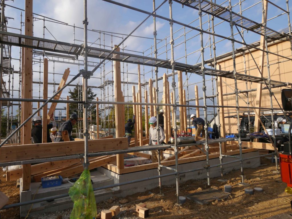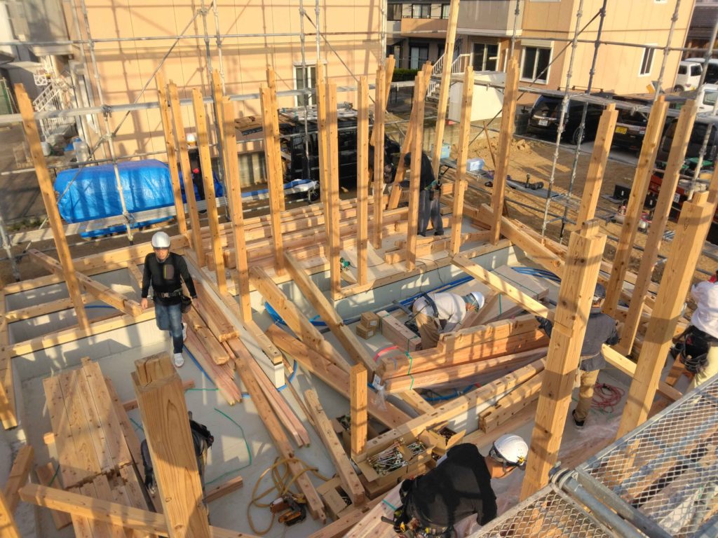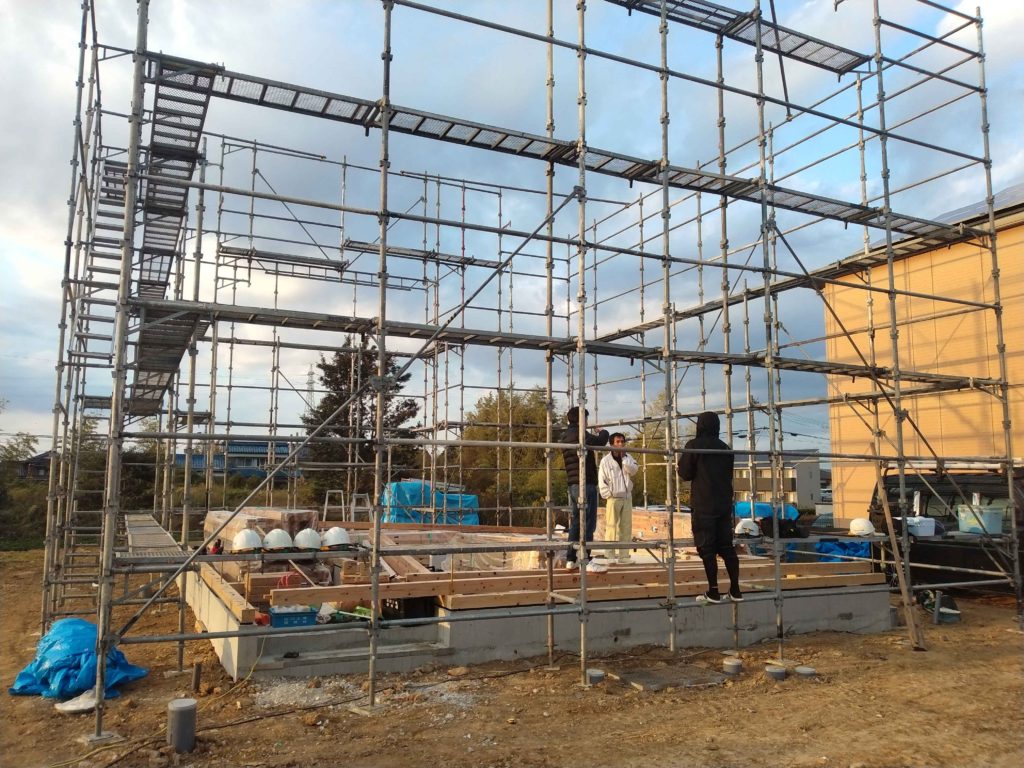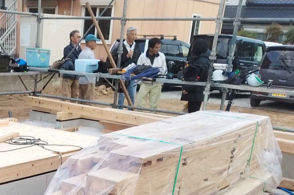 前日までに、1階床板の施工は終わっているので、当日は柱を立てるところから始まります!