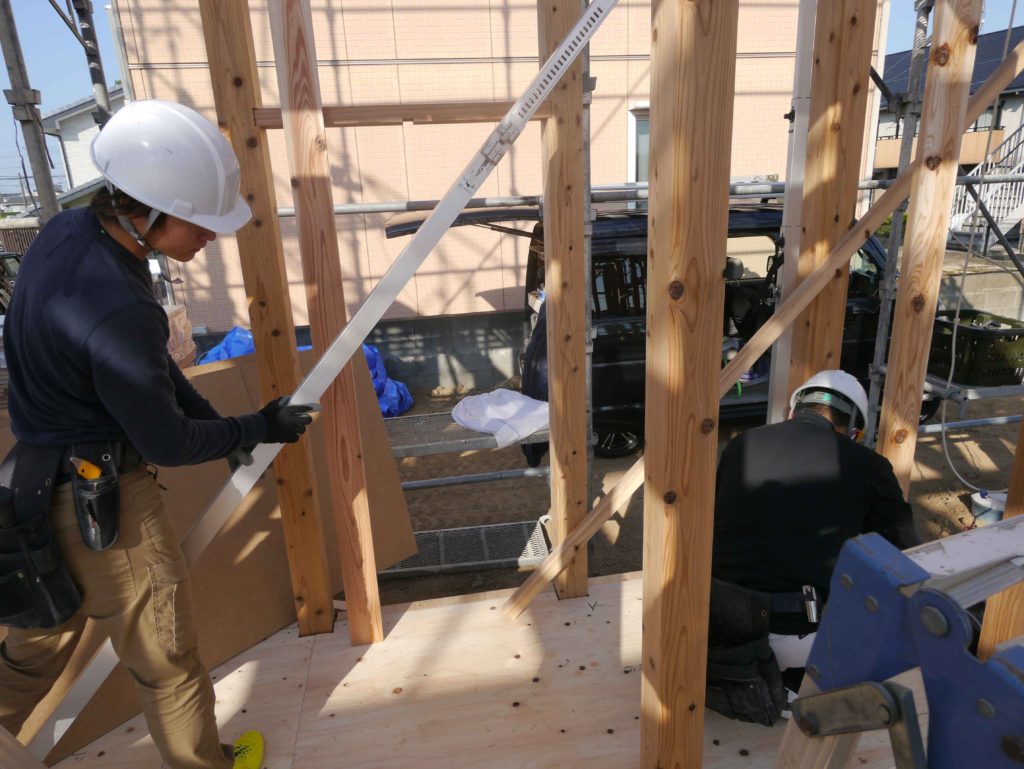 1階の柱が垂直になっているかをまず確認し、仮筋交いを固定します!