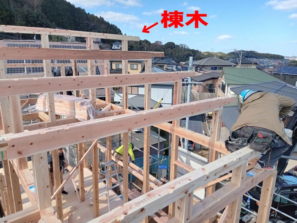 小屋組みのなかで、屋根の一番高いところに架けられる横架材を「棟木」と呼びます!