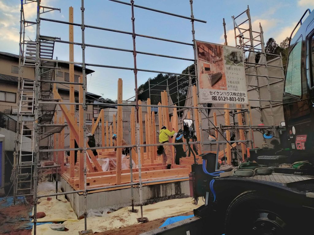 作業は、一階の柱を立てるところから始まります(#^^#)