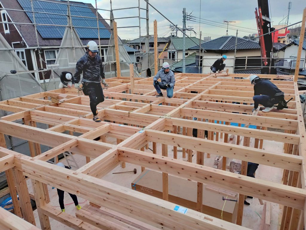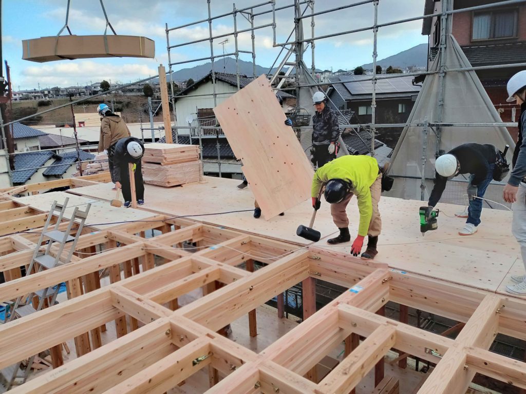 大勢の大工さんのチームワークによって、床板もあっという間に組まれていきました!