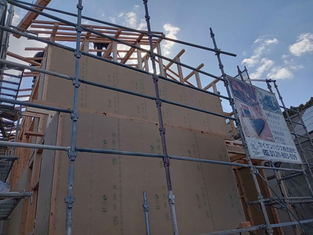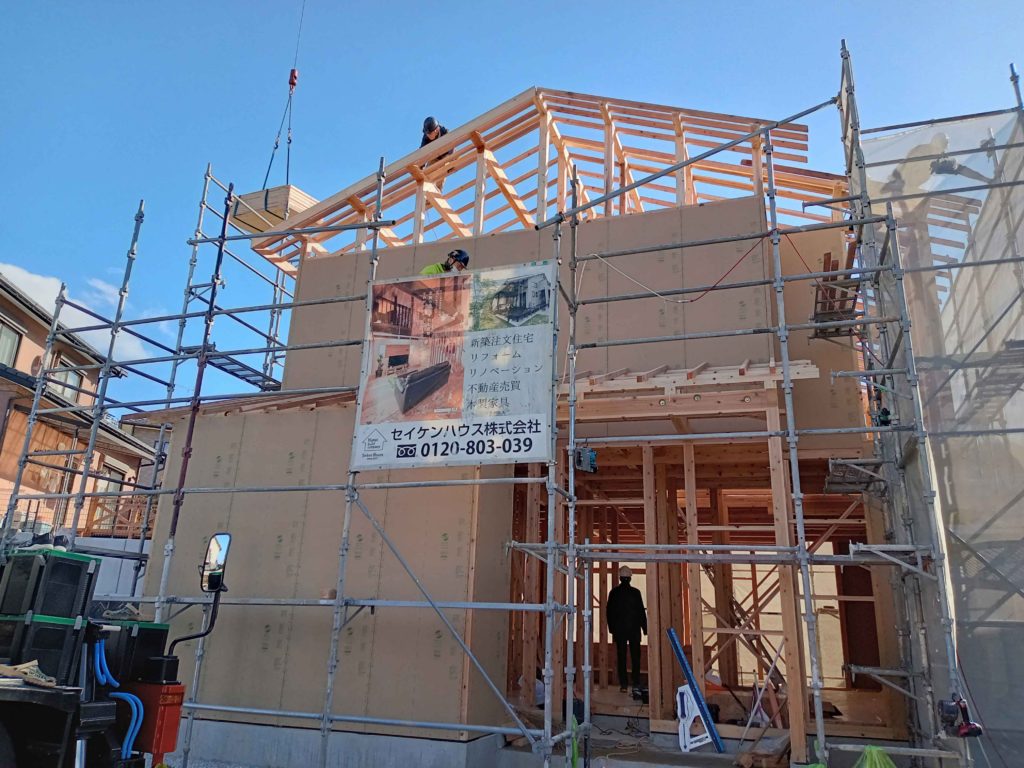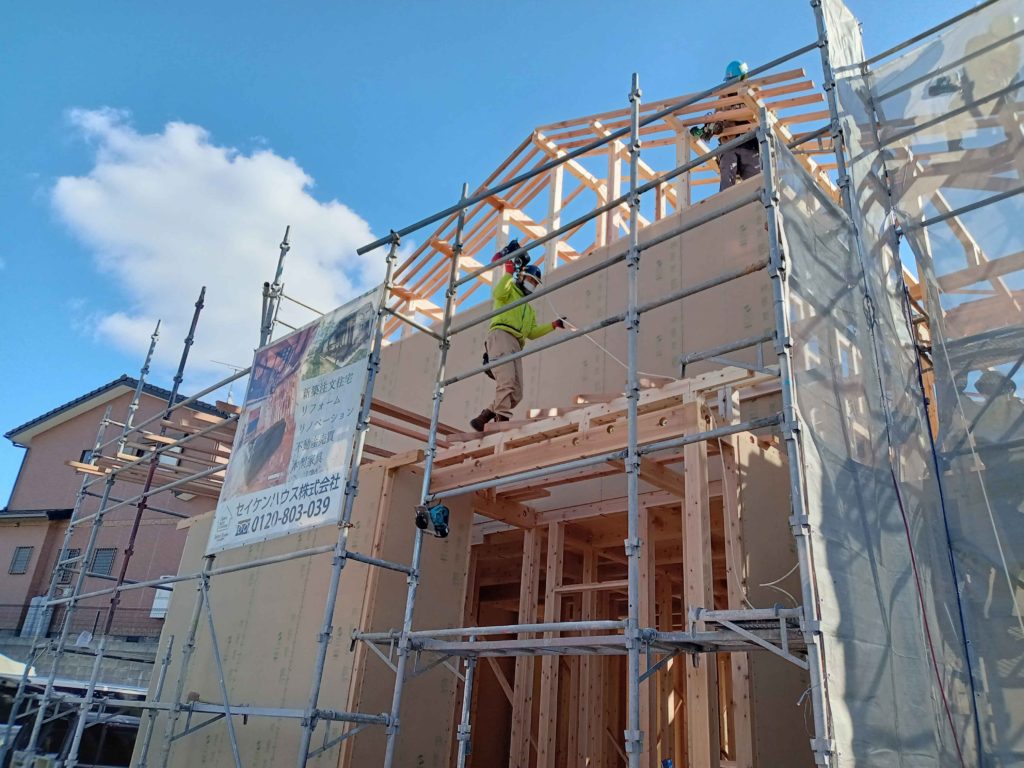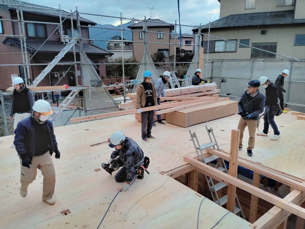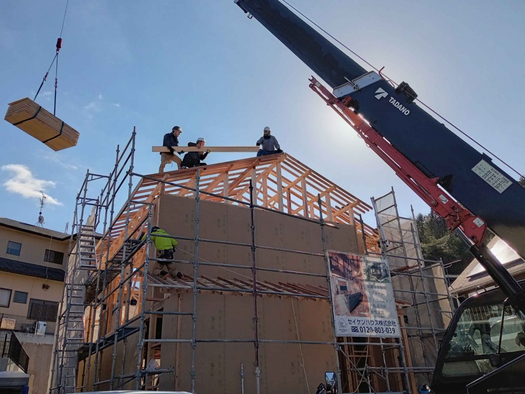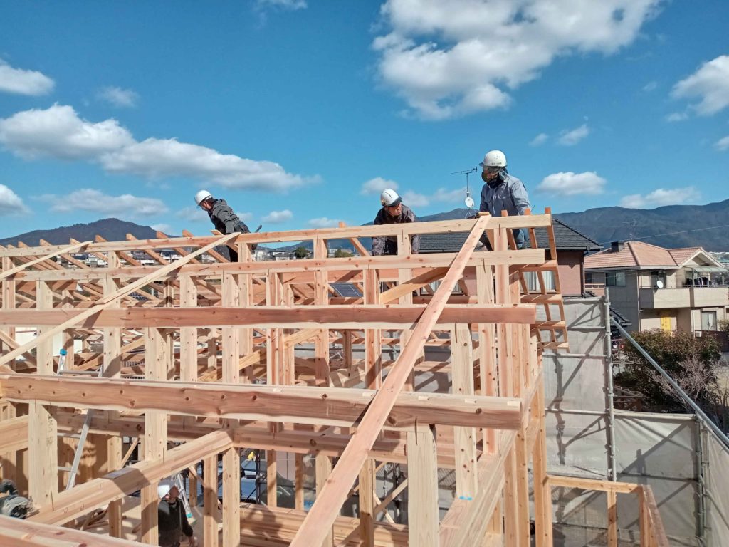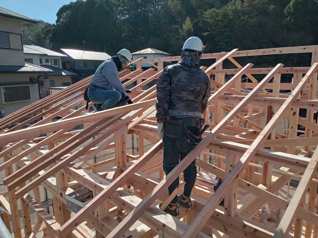 この棟木を納めることを上棟と呼ぶのですが、これで作業は終わりではなく、作業はまだまだ続きます!