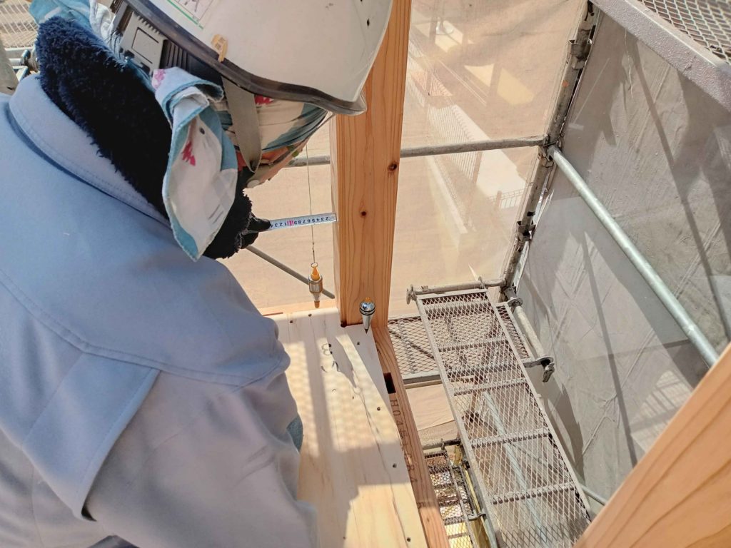 そしてやはり、1階と同様に下げ振りで垂直を確認します!