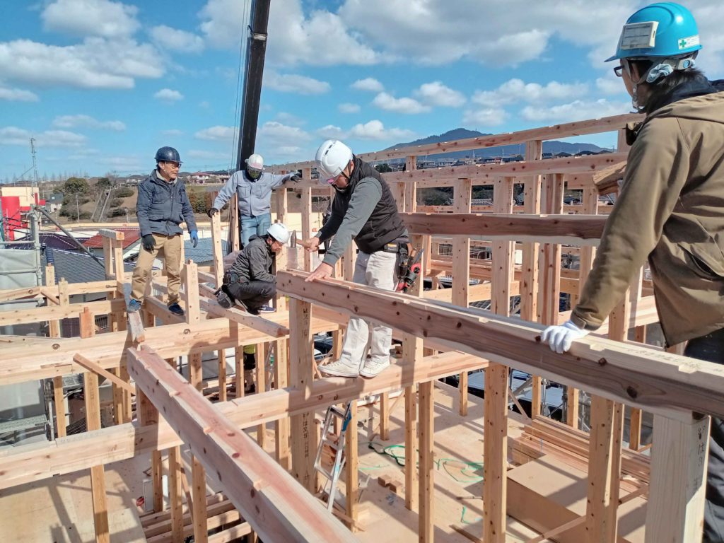 2階の梁の次には、屋根にあたる小屋組みの工程を行います!