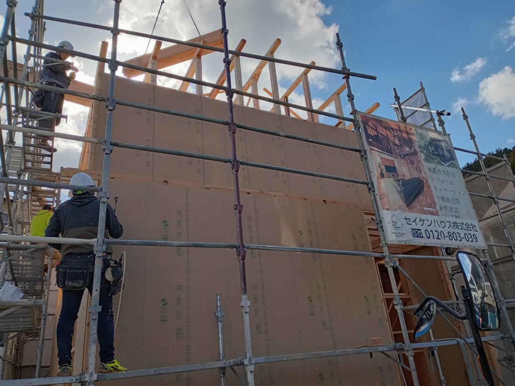 同時に柱と柱の間に耐力面材(ハイベストウッド)を張っていきます!