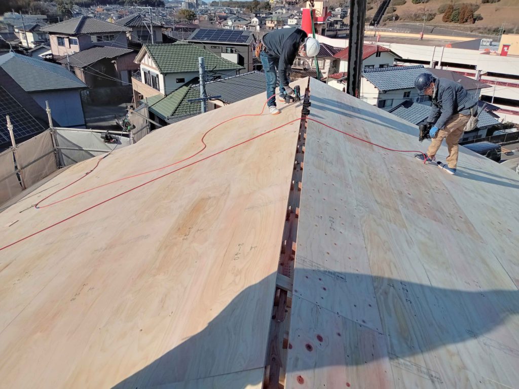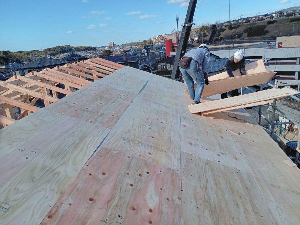 屋根の骨組みが出来上がると、野地板で屋根の下地を造ります!