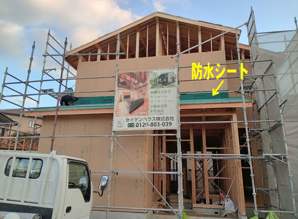 万が一の雨に備えて、防水シートを野地板の上に張りました!