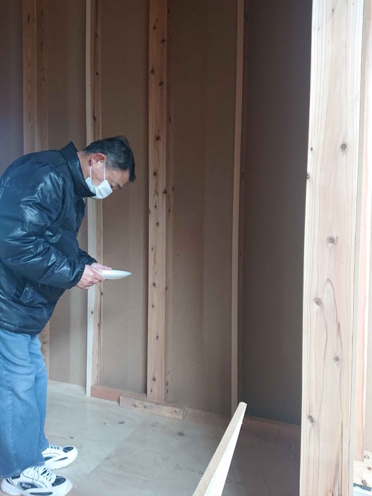 お清めの意味で、四隅の柱に酒、米、塩を撒いて工事の安全祈願を行います!
