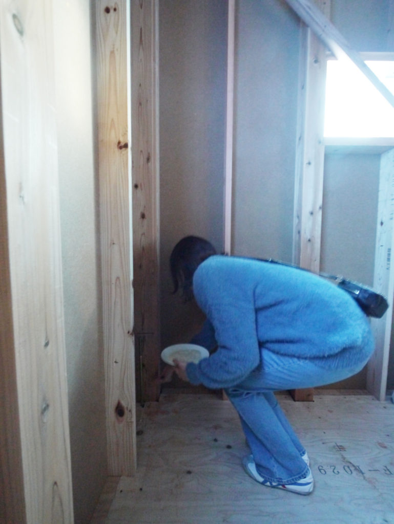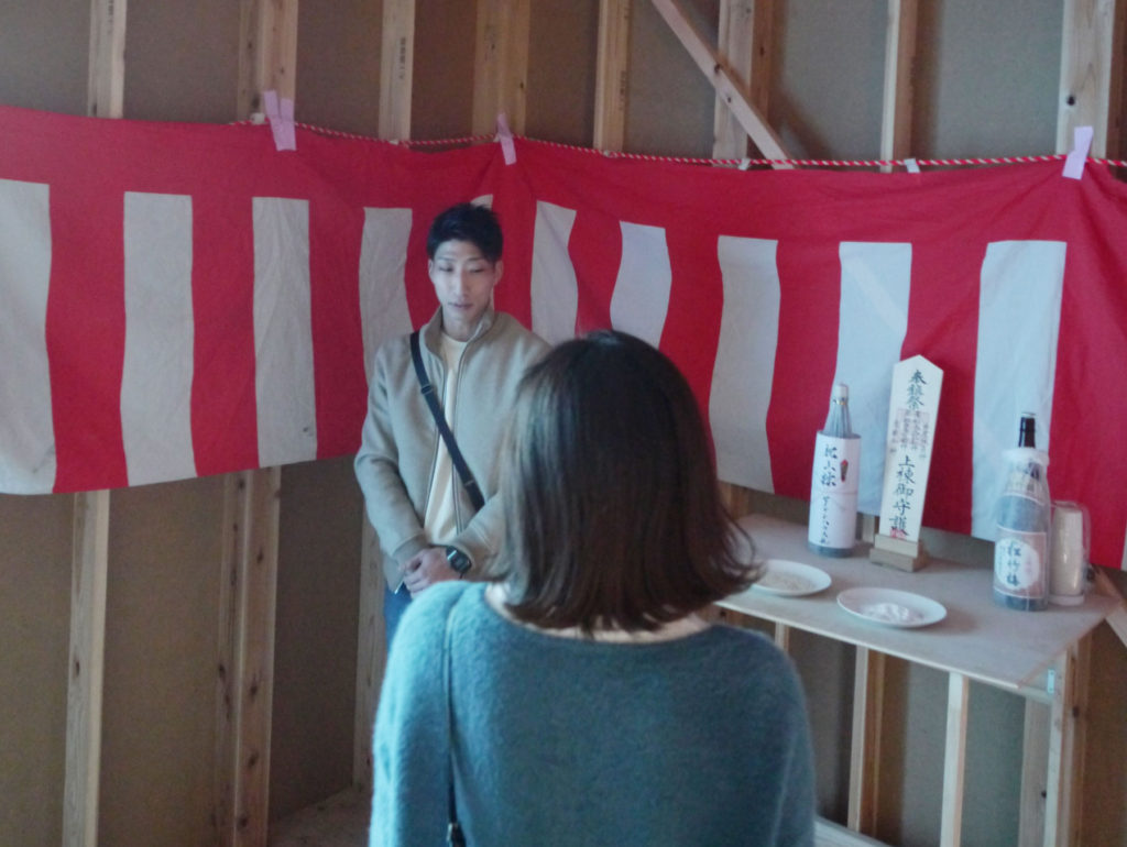 「四方固めの儀」とも呼ばれていますが、建物の四隅の柱にお神酒、お塩、お米を撒いて清め、今後の工事の無事安全を祈ります(^^♪