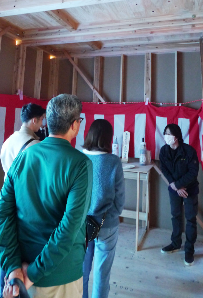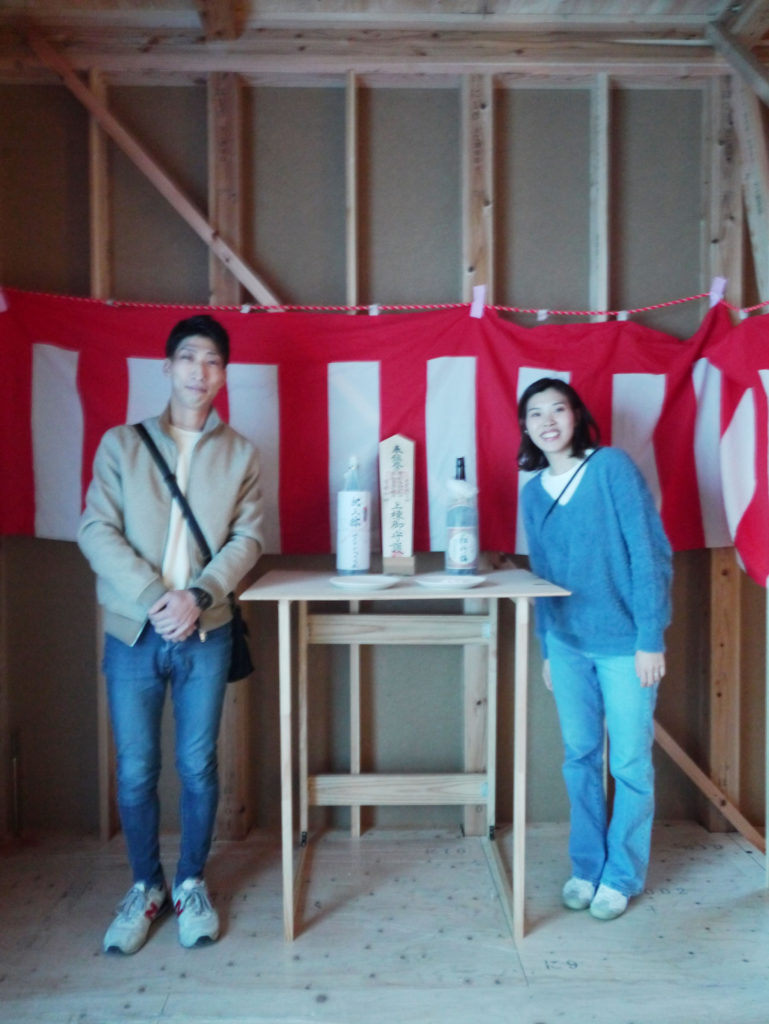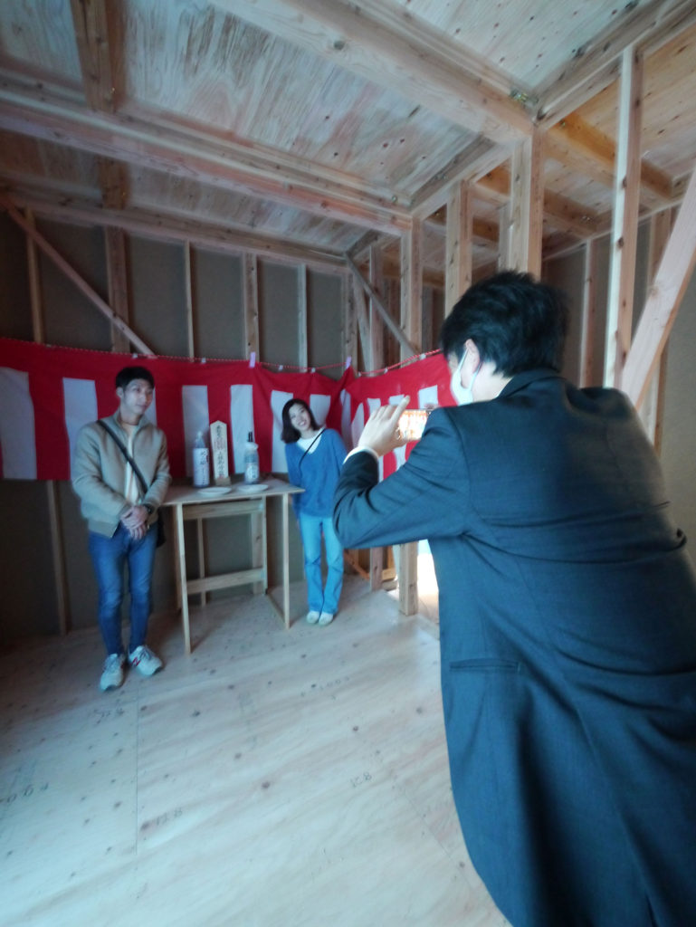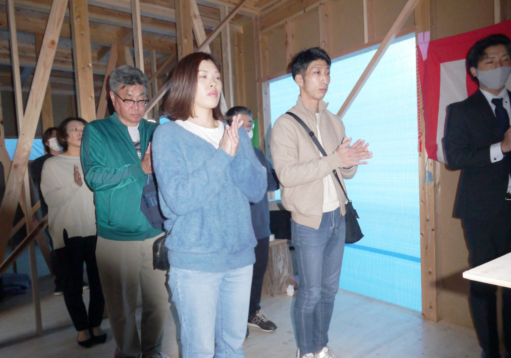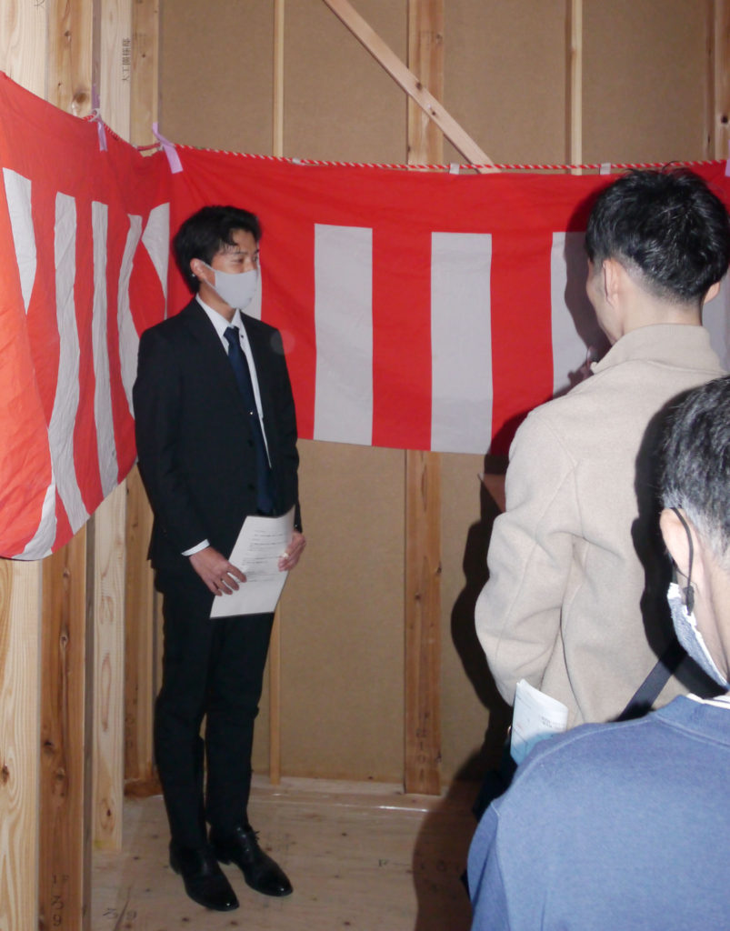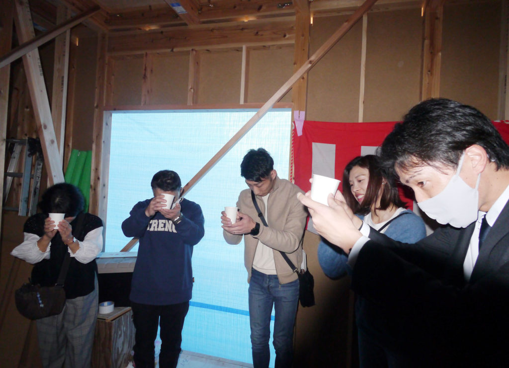 無事に棟が上がったことへの感謝の気持ちと、竣工まで工事が無事安全に進むように気持ちを込めて上棟式を行いました!