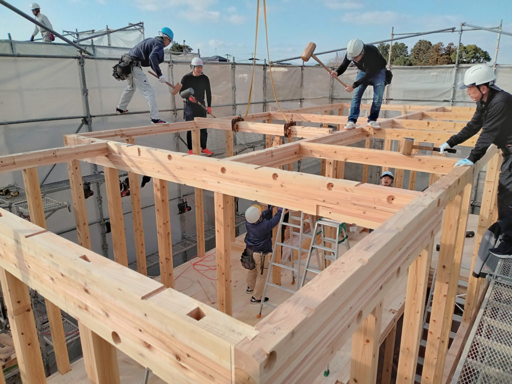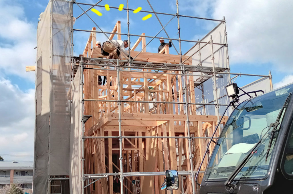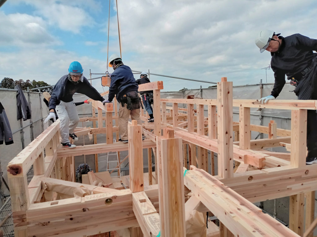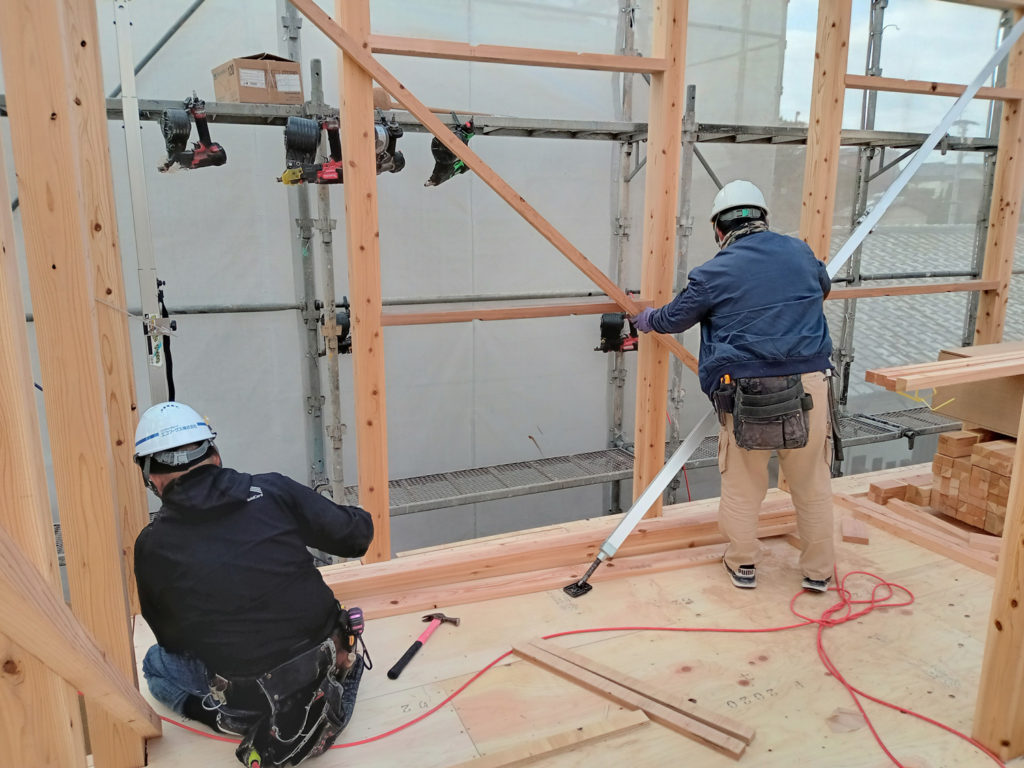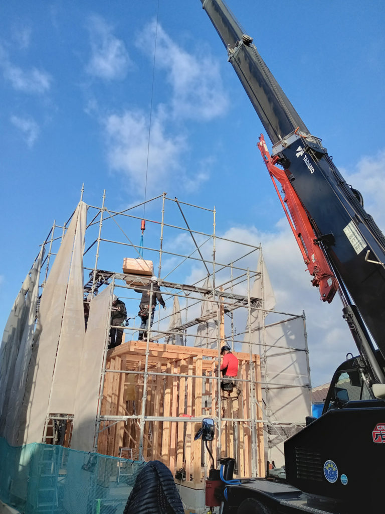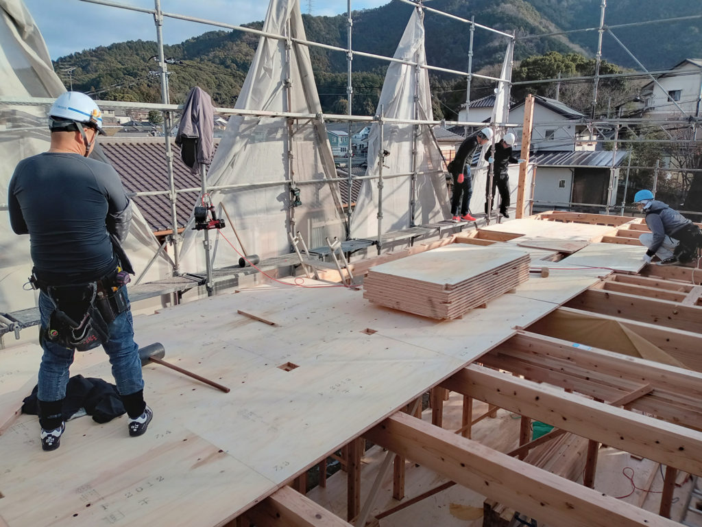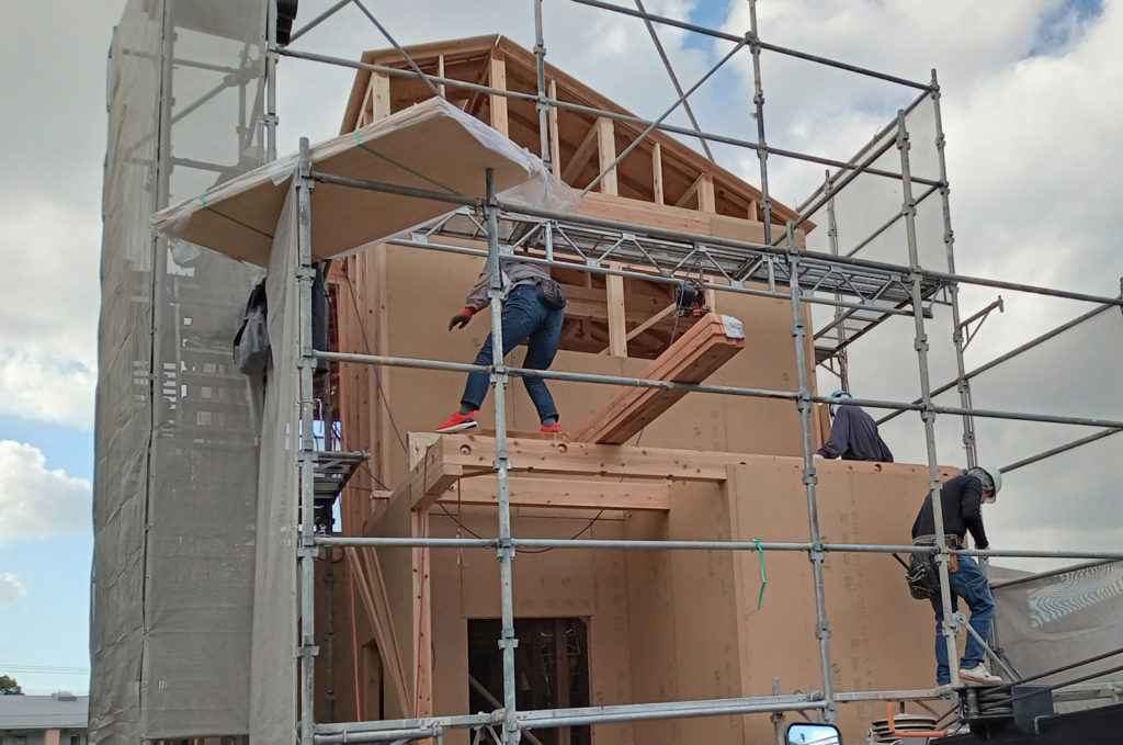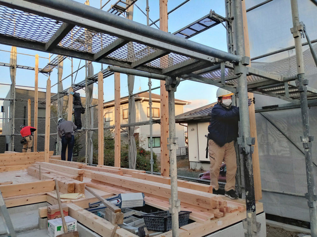昔は建物全体の骨組みを先に組んでいたようですが、先に床板を設置する方が、大工さんたちの安全確保になりますし、よりスピーディーに工事を進めることができます!