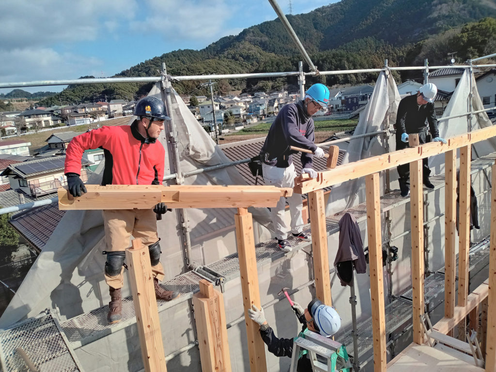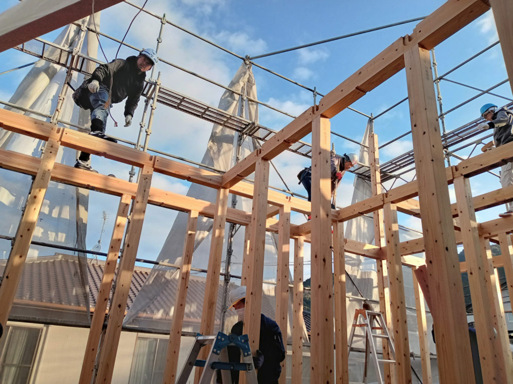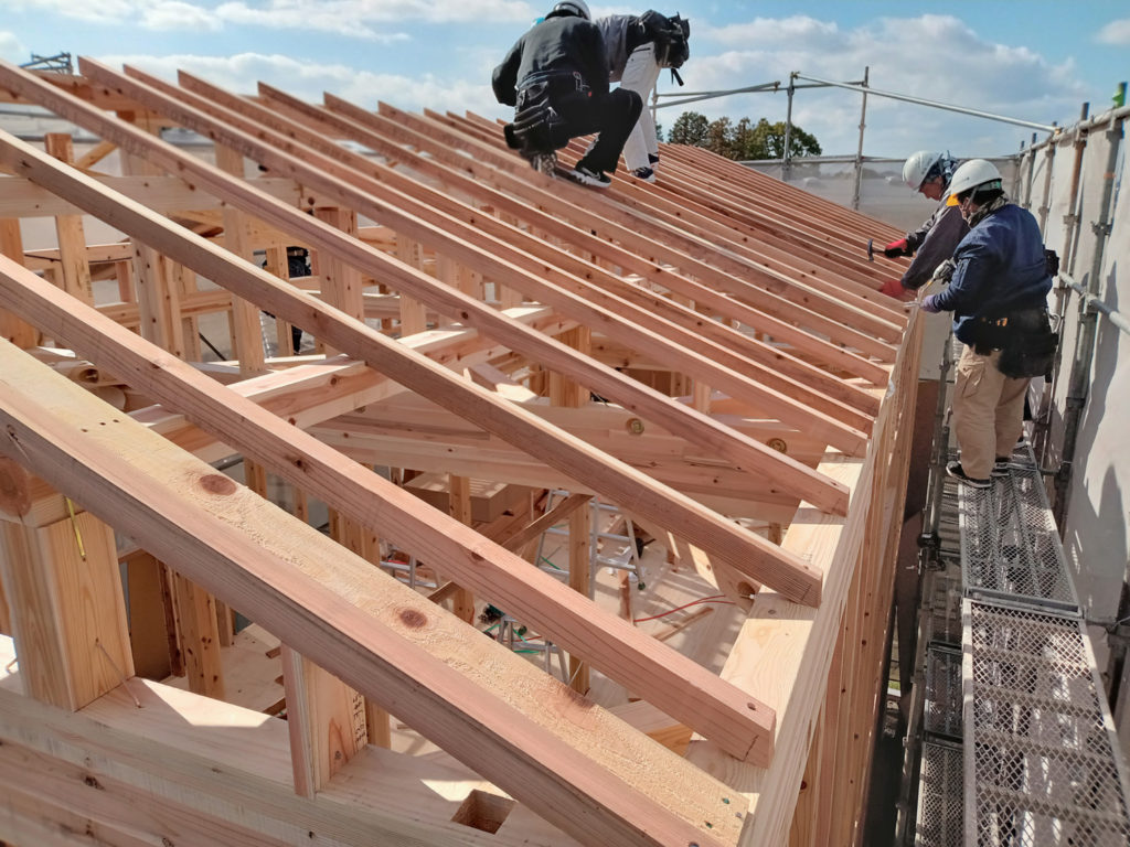 基礎工事完了後の土台の状態から柱、梁などを施工し、屋根小屋組みの工程で一番高いところに納める横架材を棟木と呼びます!
