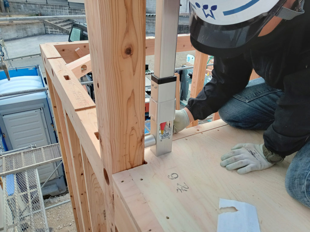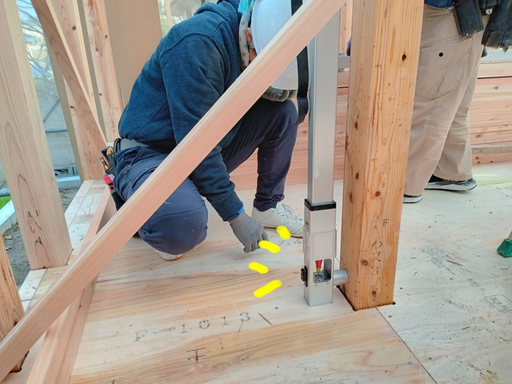 柱が垂直になるように調整し、仮筋交いで固定します!