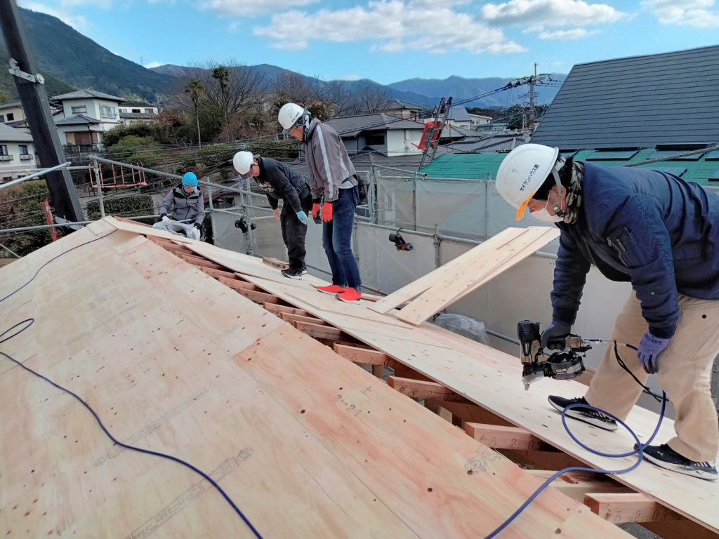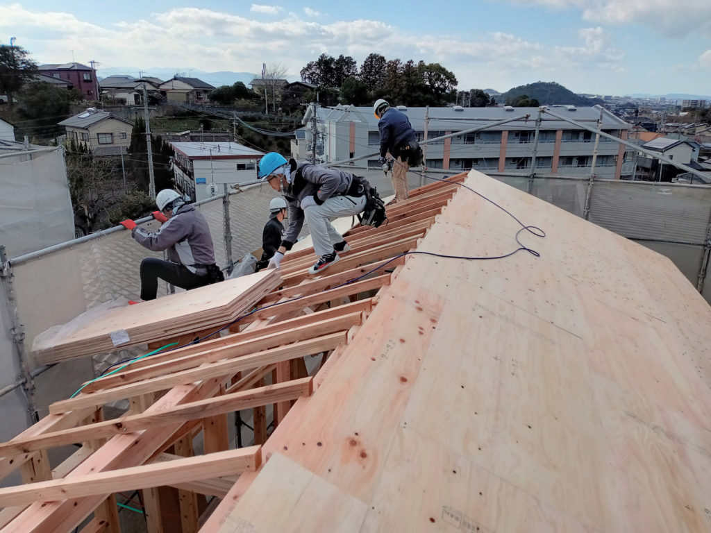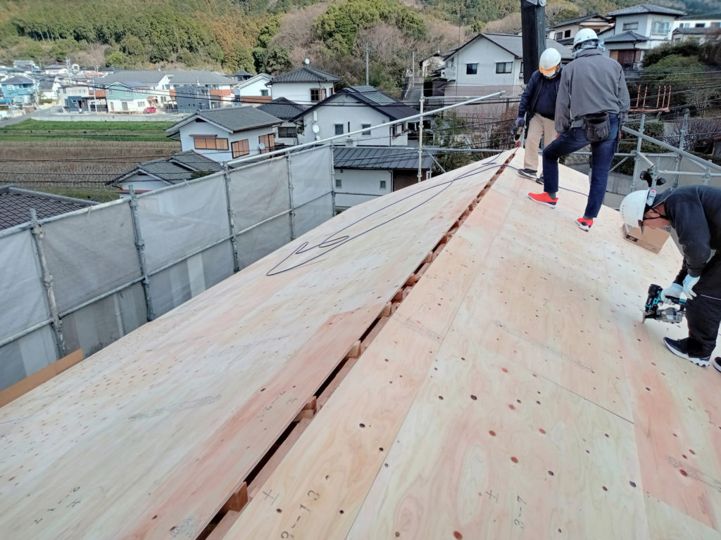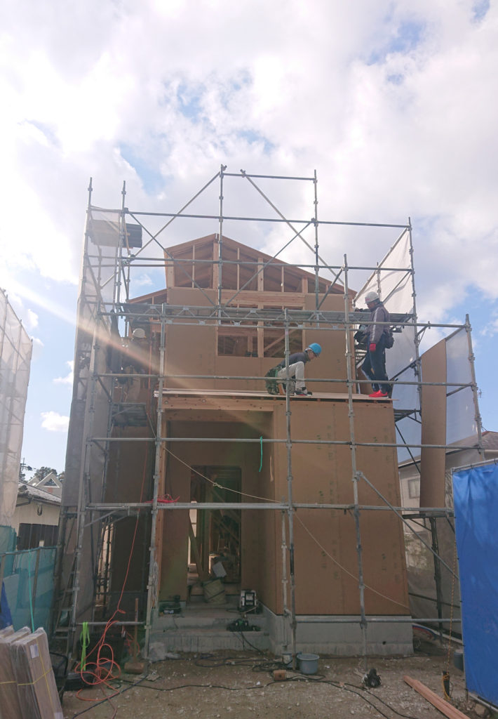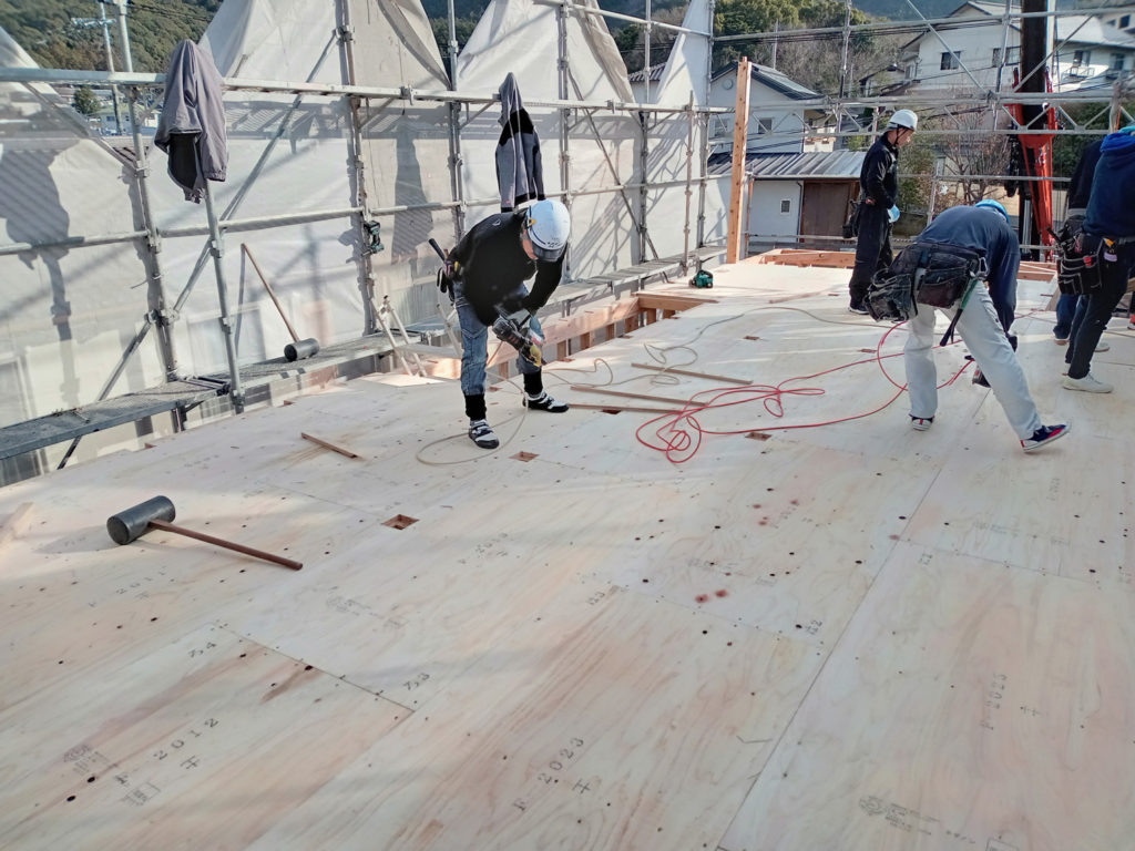 そして、屋根の下地工事と同時進行で、壁に耐力面材(構造用ハイベストウッド)を施工します!