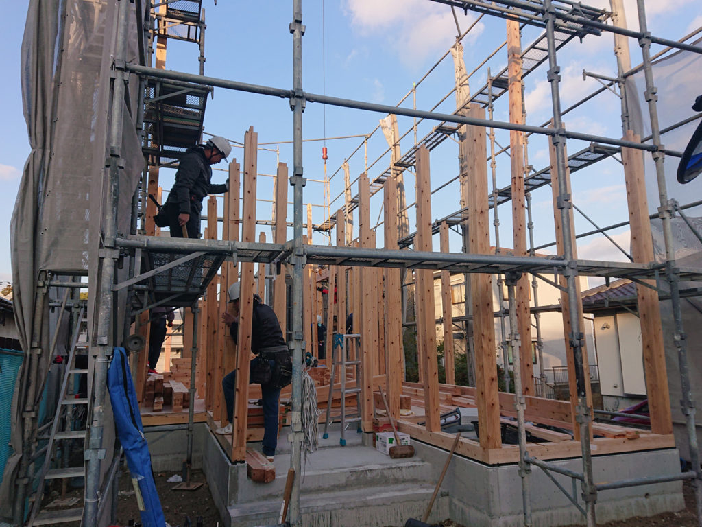棟上げの工程としては、まずは1階の柱を立てるところから始まります!