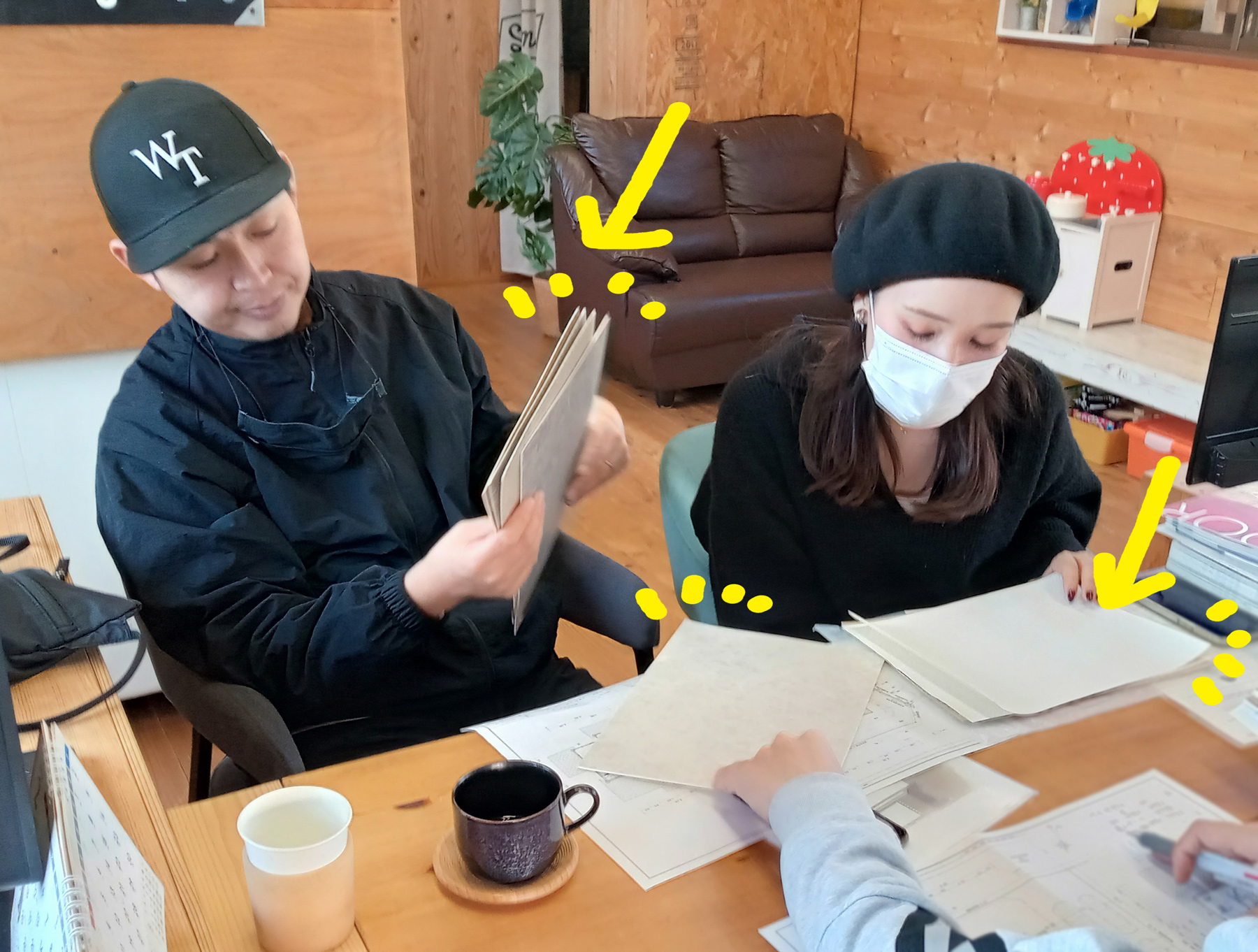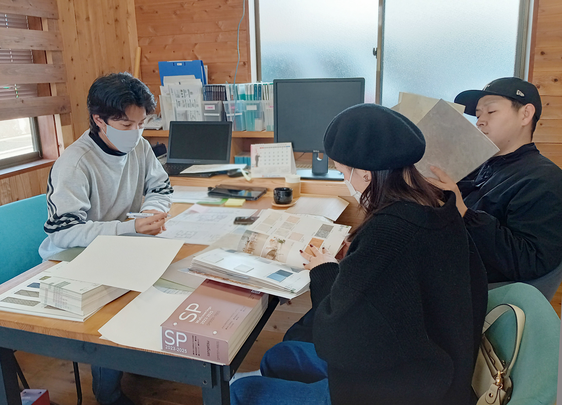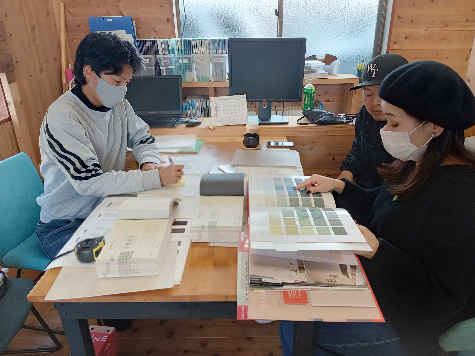 今回、K様との打ち合わせでは、カタログだけでなく、気になるクロスのサンプルを取り寄せていたので、サンプルを見ながら検討しました!