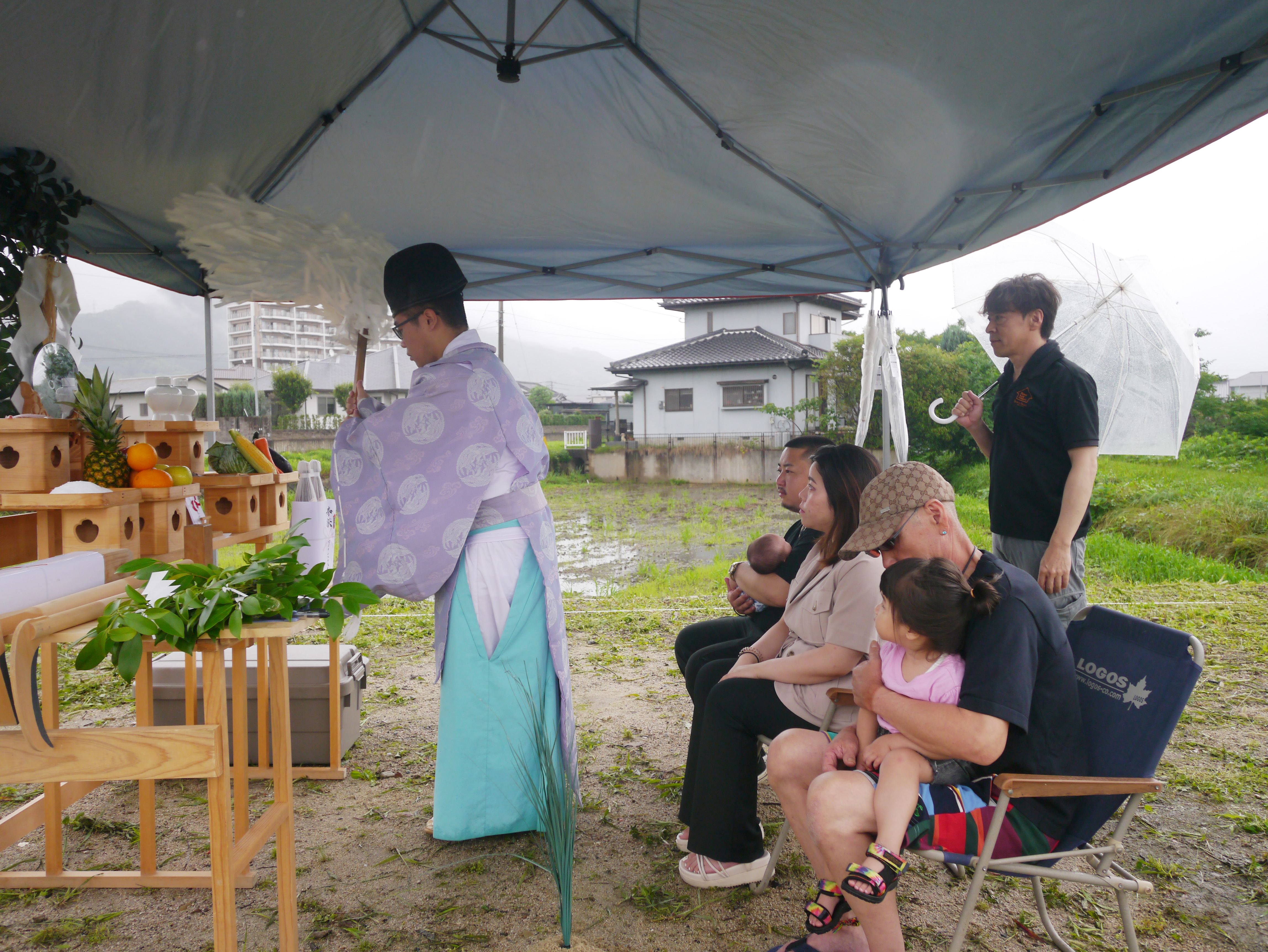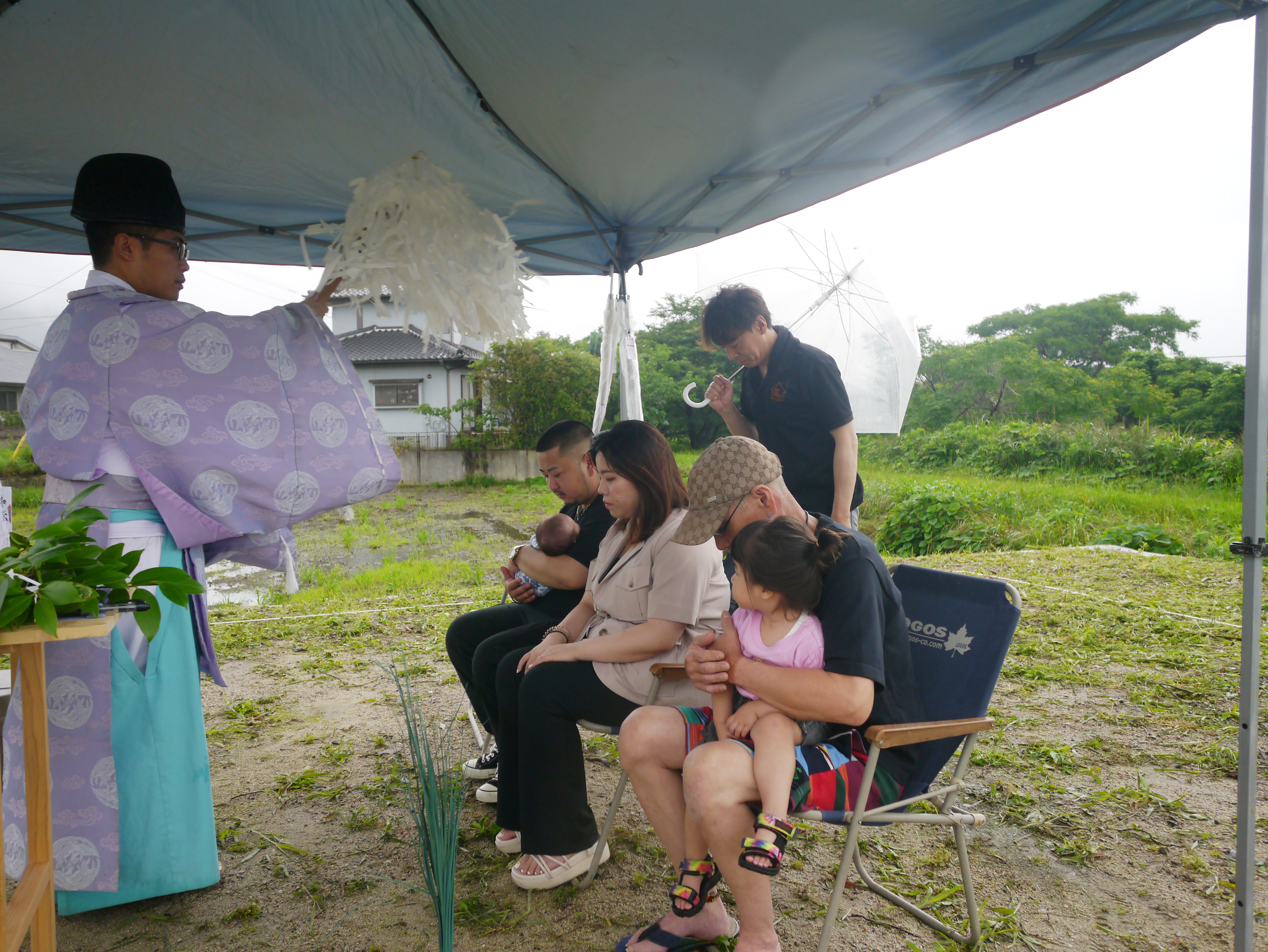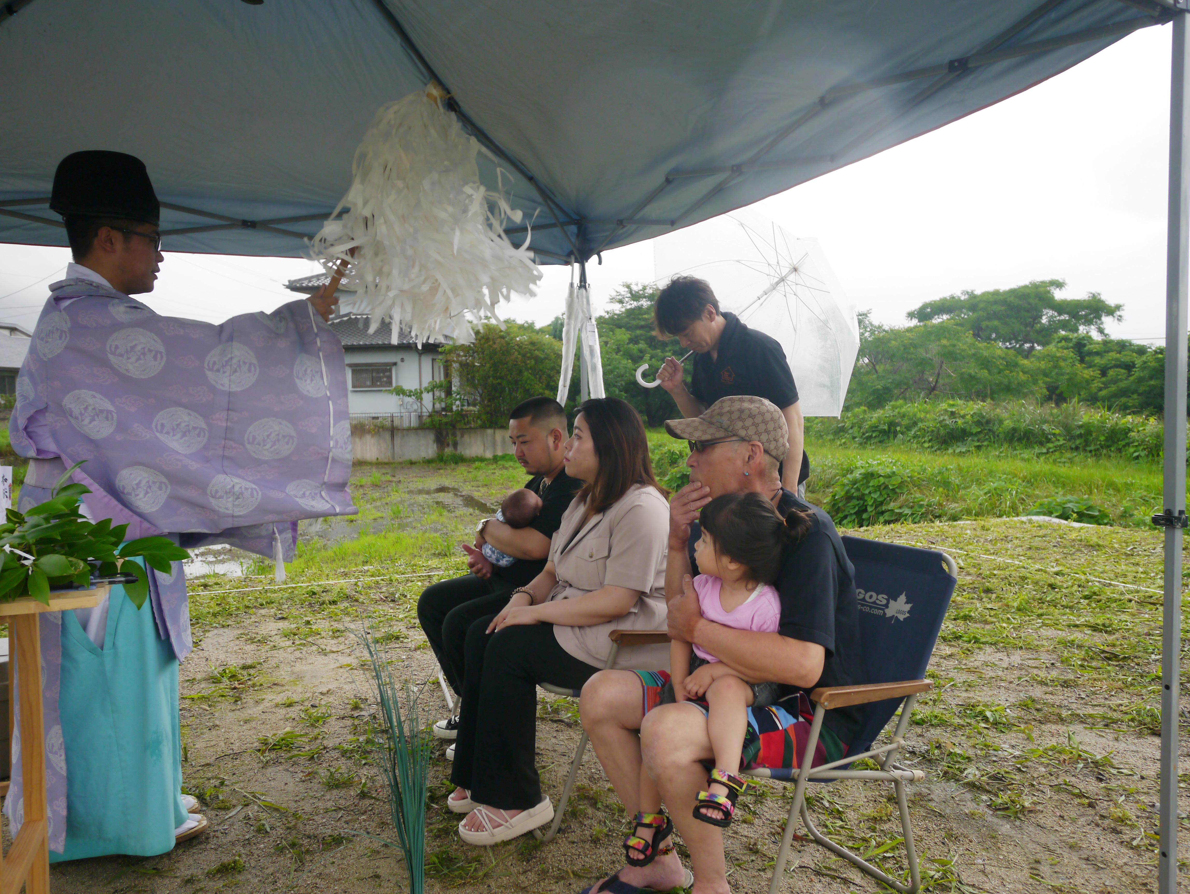 6月と言えば梅雨☂K様家の地鎮祭も、朝から雨がポツポツ!風も吹いています!