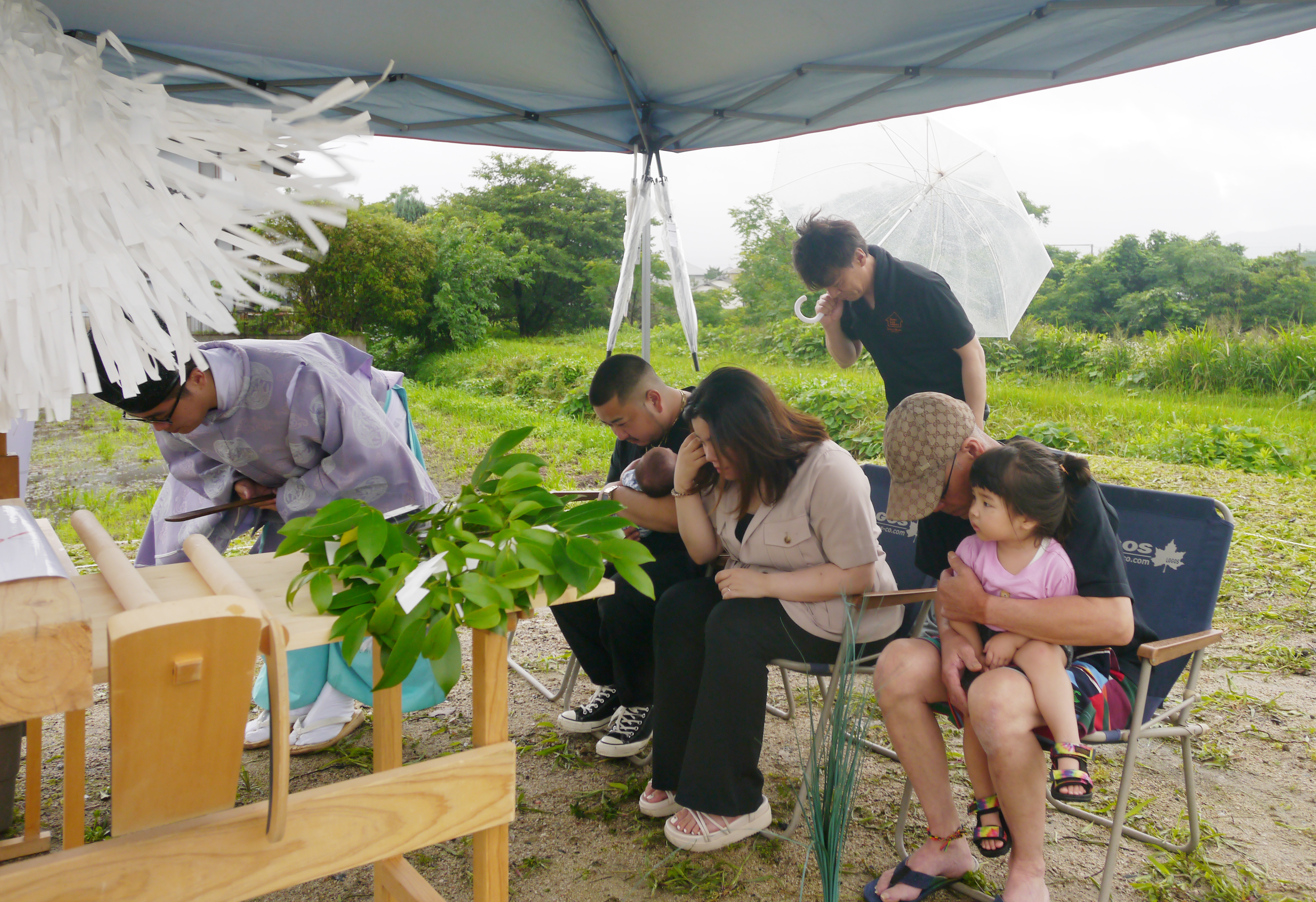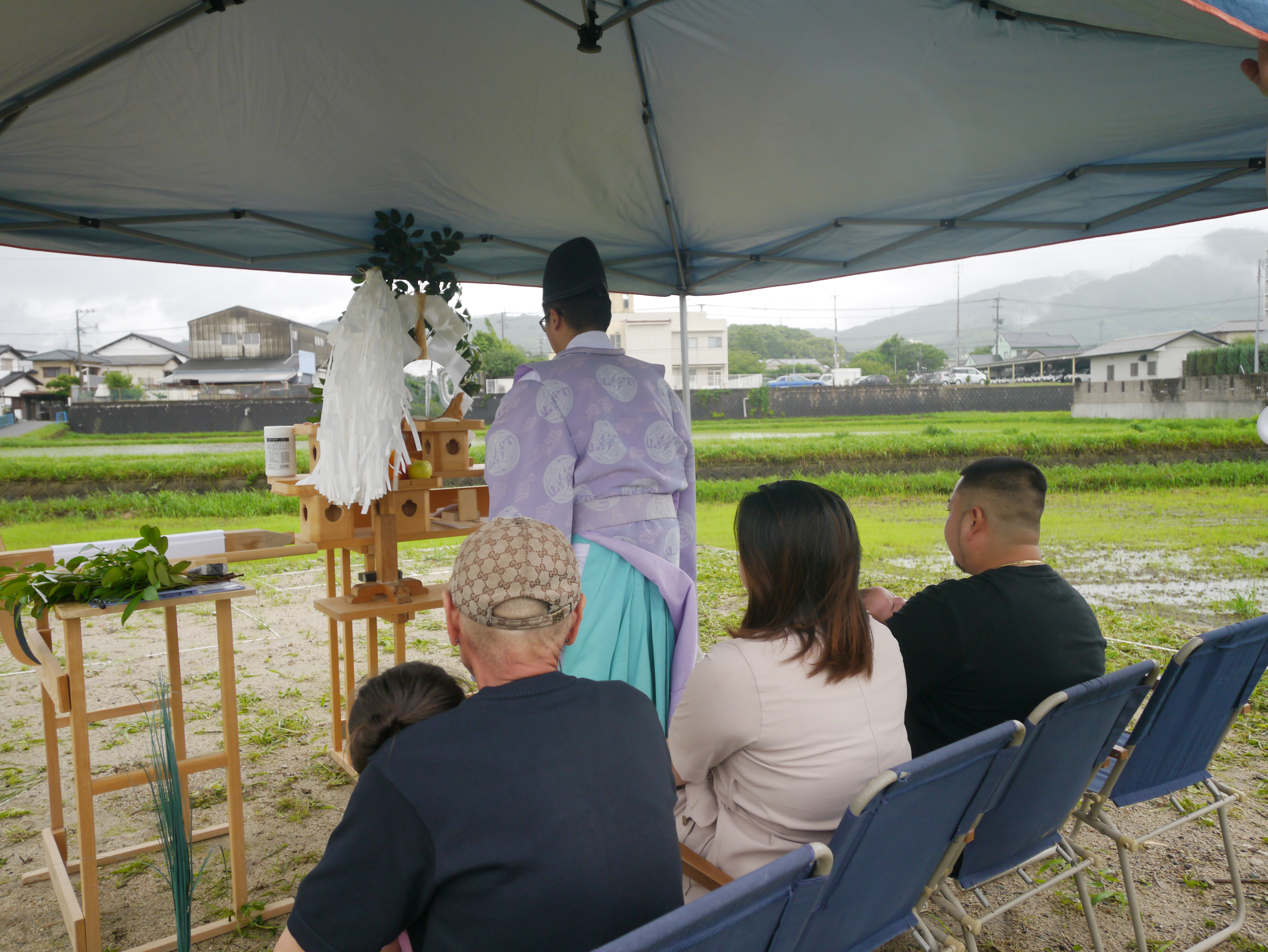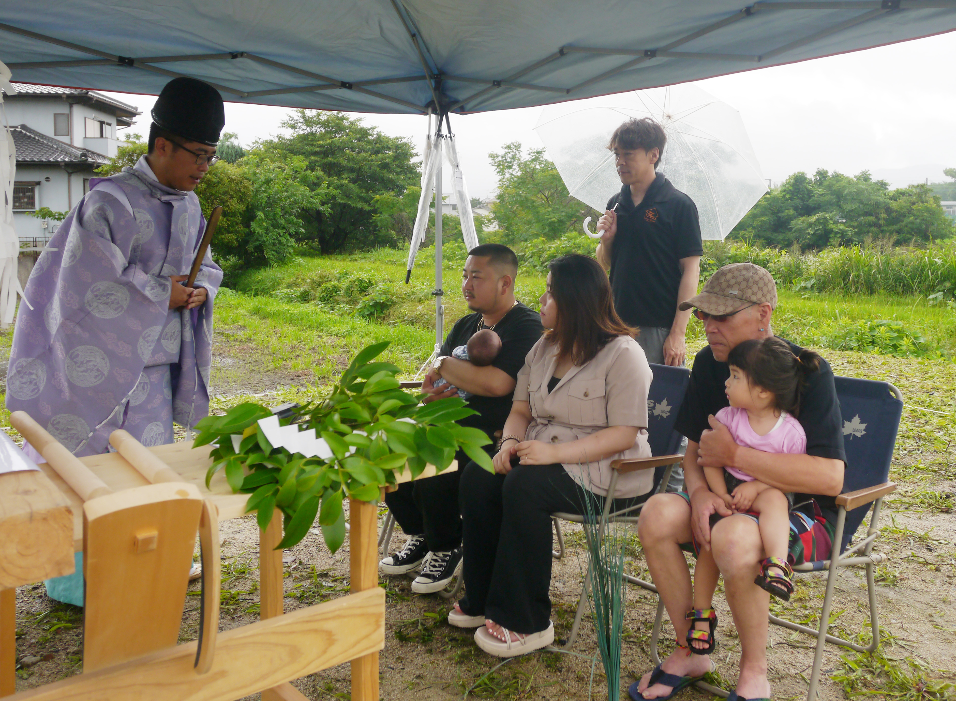 6月と言えば梅雨☂K様家の地鎮祭も、朝から雨がポツポツ!風も吹いています!