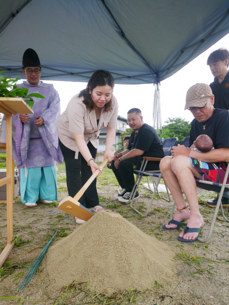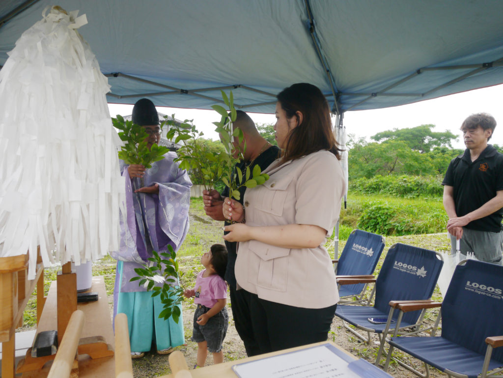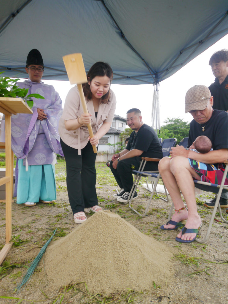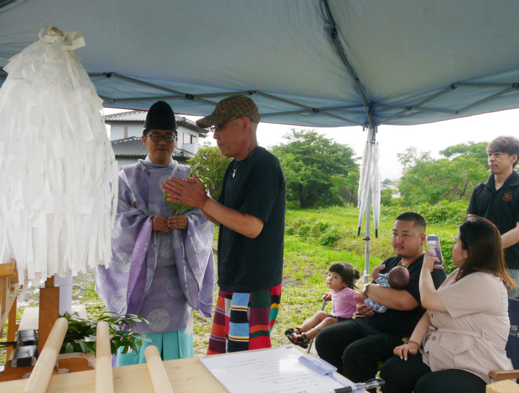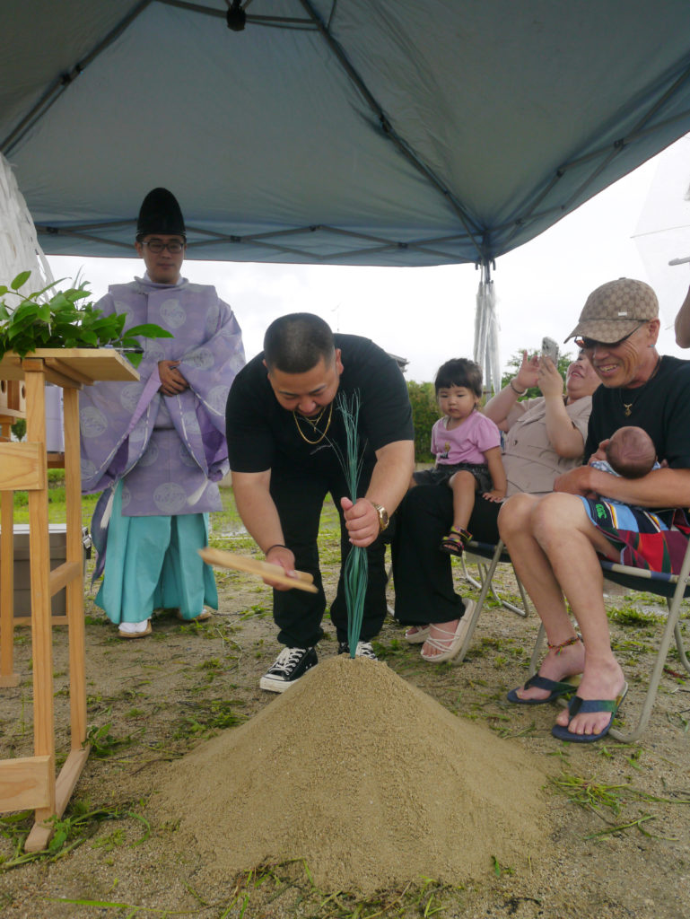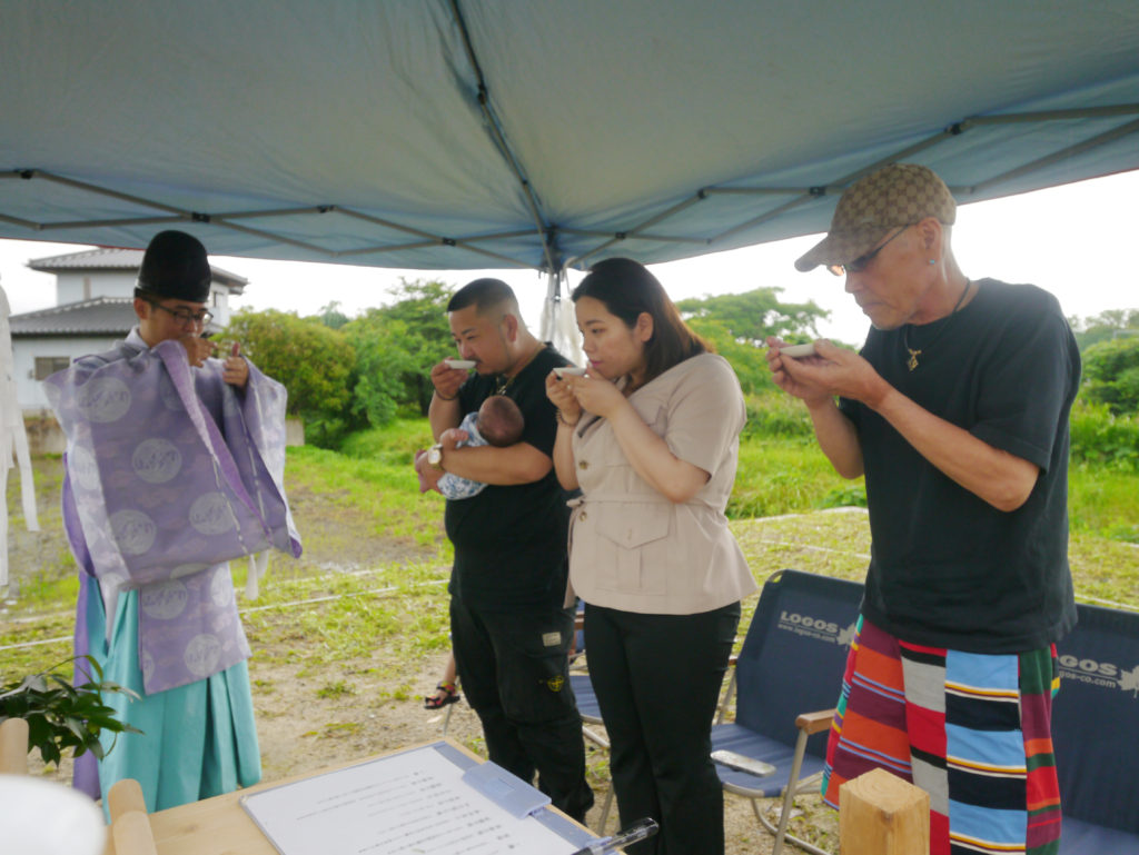 清祓いとも呼ばれていますが、土地の四隅を神主さんが祓い、続いて施主様がお酒、お塩を撒いて清めます!