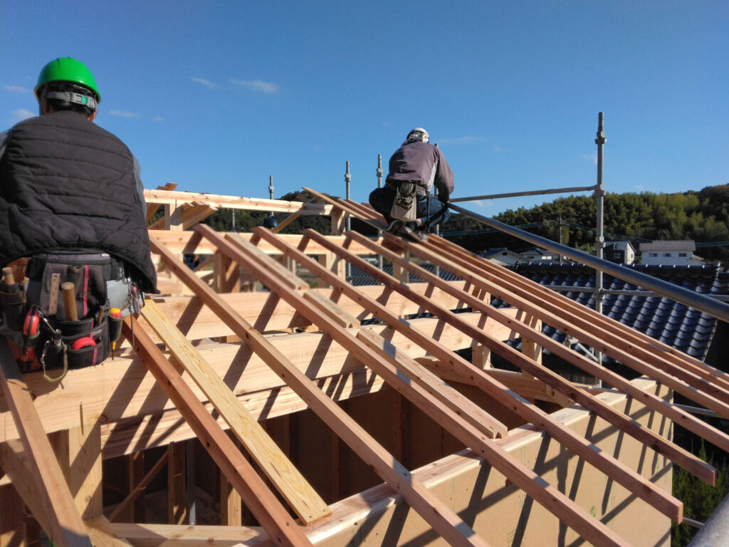 棟が上がった横架材の上に、垂木を並べ、屋根の下地工事に進みます!