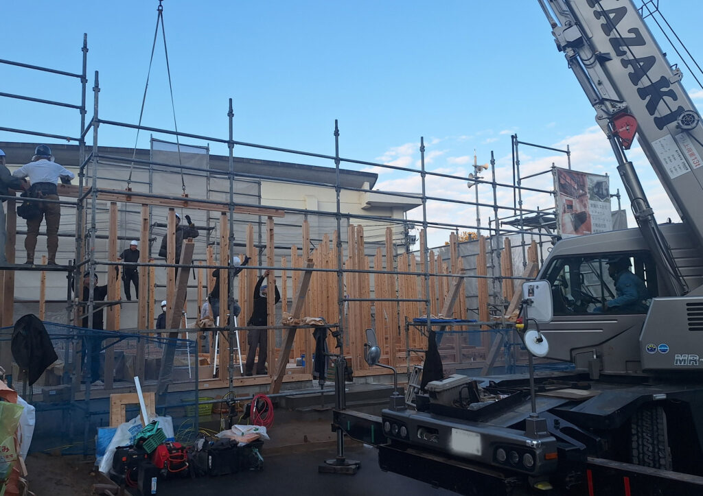 柱を立て終わると、次に柱と柱の頭を繋いでいく梁などの横架材を組んでいきます!