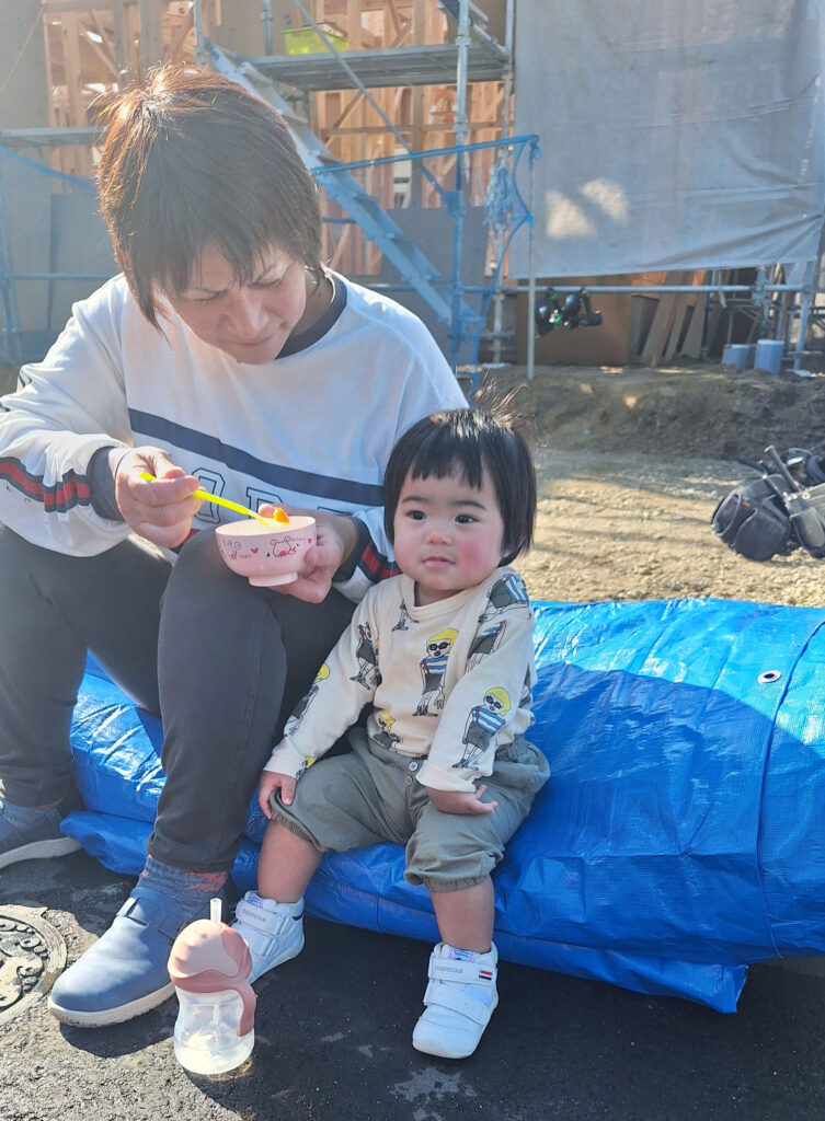 家が建っていく中、みんなで輪になっていただくお昼ごはんは、格別に美味しく感じます!