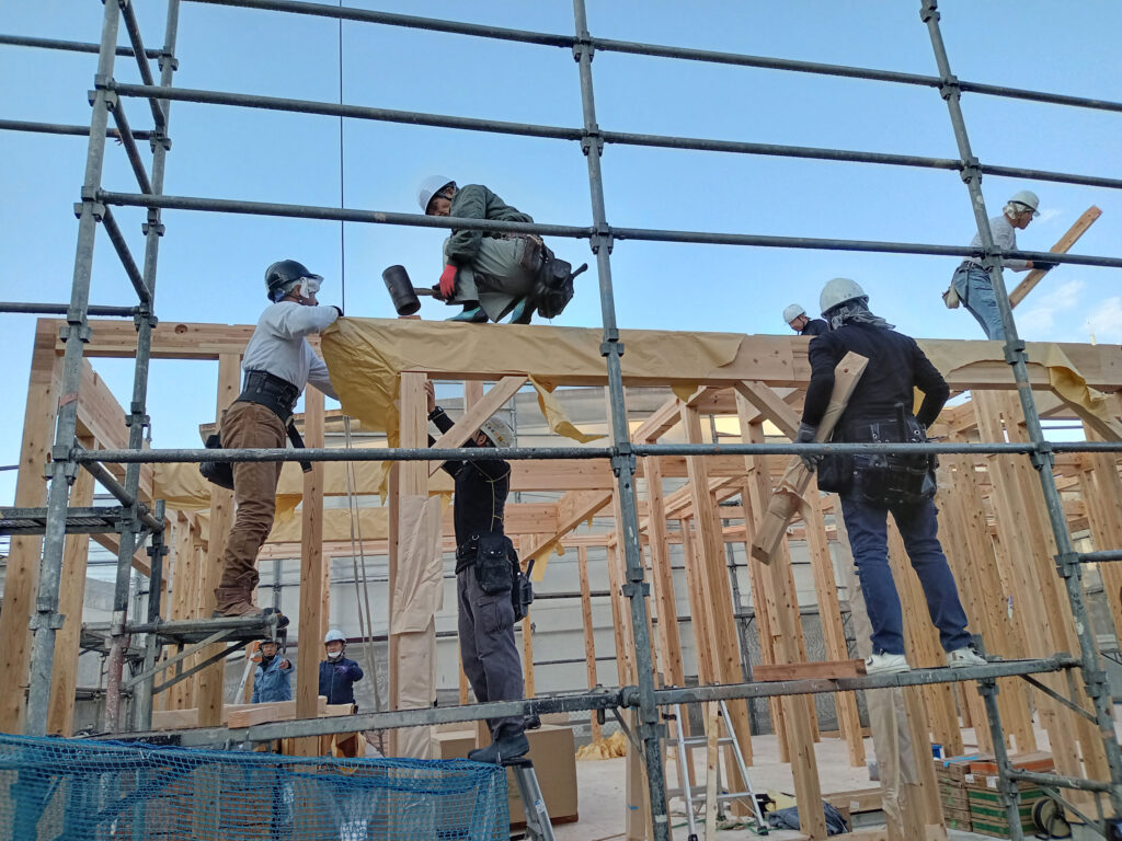 そして、面材を貼る作業と同時に、屋根の下地工事も進んでいます!