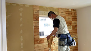 宗像市ひかりヶ丘M様邸のクロス工事の様子です♪ 断熱材を吹付け、電気配線等行ったあとに、ボードを打ちつける工事を行うと、いよいよ壁の土台のできあがりです♪ 打ちつけた後の凹凸をパテで均一にしたら、クロス工事...