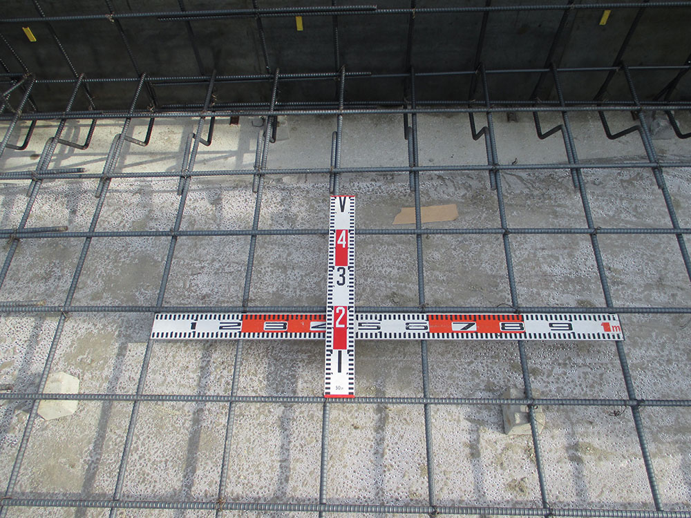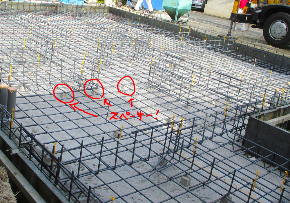 鉄筋の下にスペーサーブロックを敷いて鉄筋の下側の厚みを確保しました!