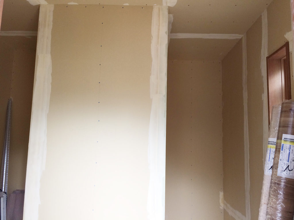 断熱材を吹付、電気配線などを行った後、ボードを打ち付ける工事を行うといよいよ壁の土台の出来上がりです!