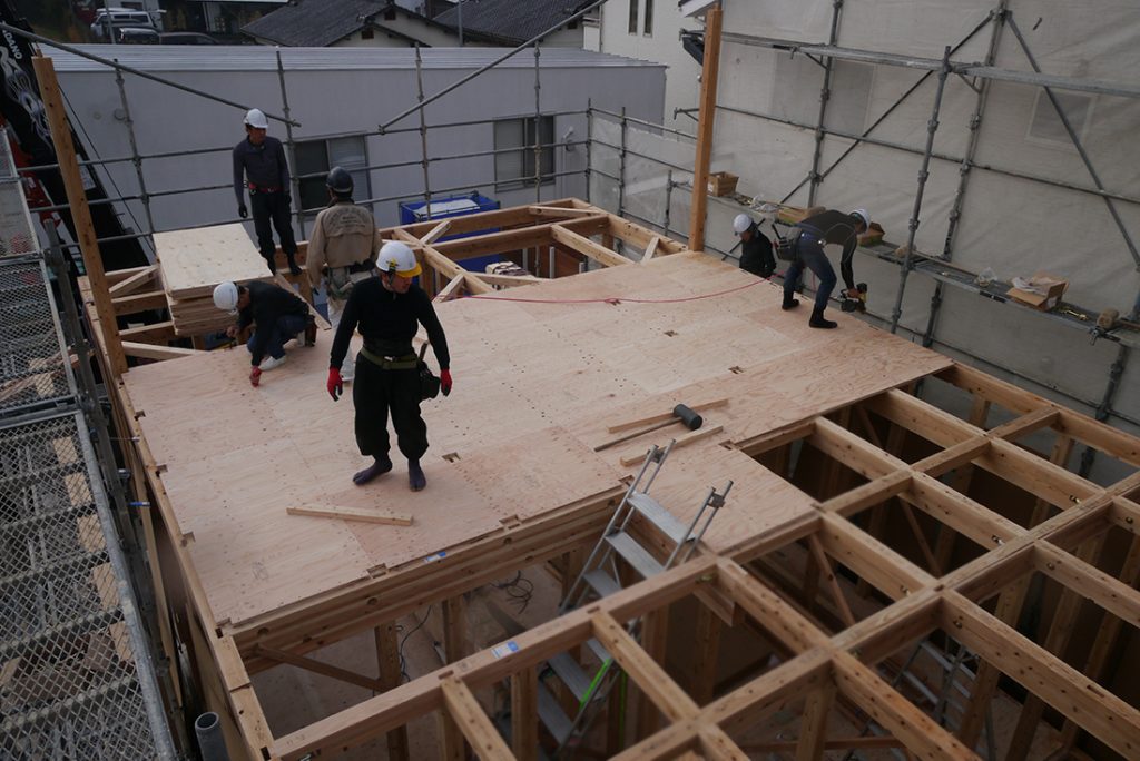屋根の下地工事まで進み、この日の棟上げ工事は無事終了です!