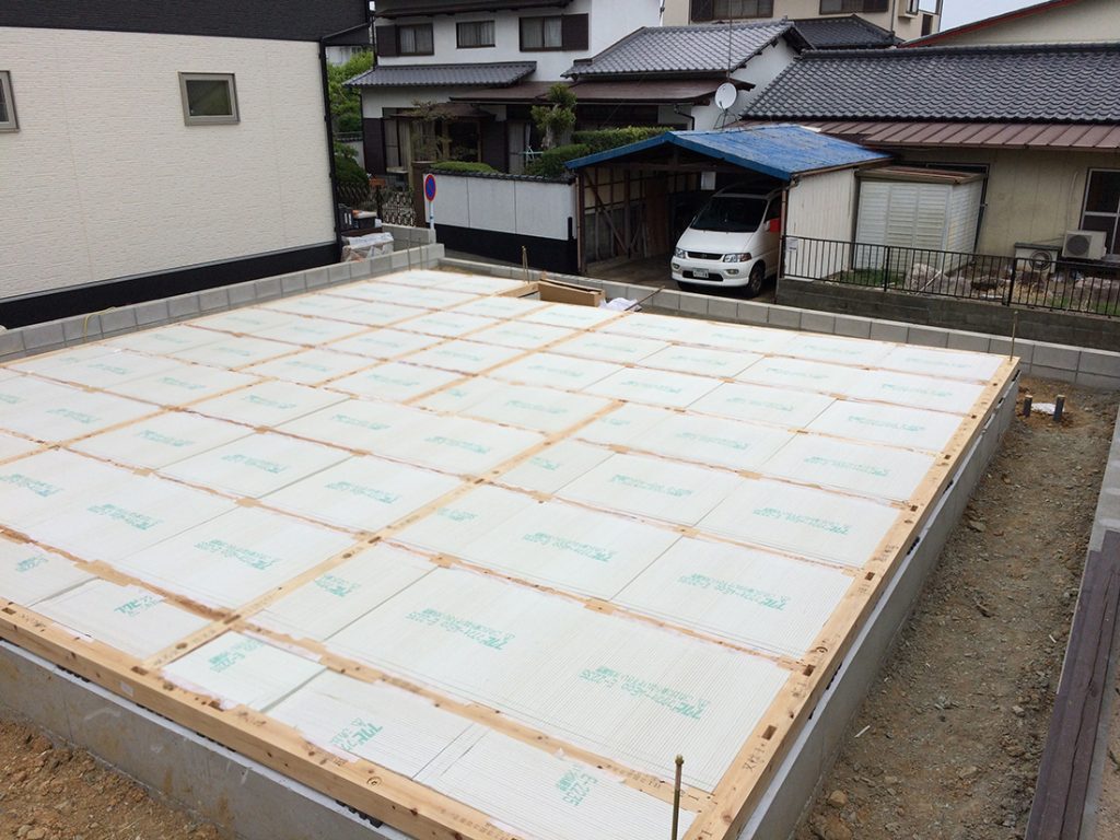 土台を敷いた上に、今度は床下断熱材を貼っていきます!