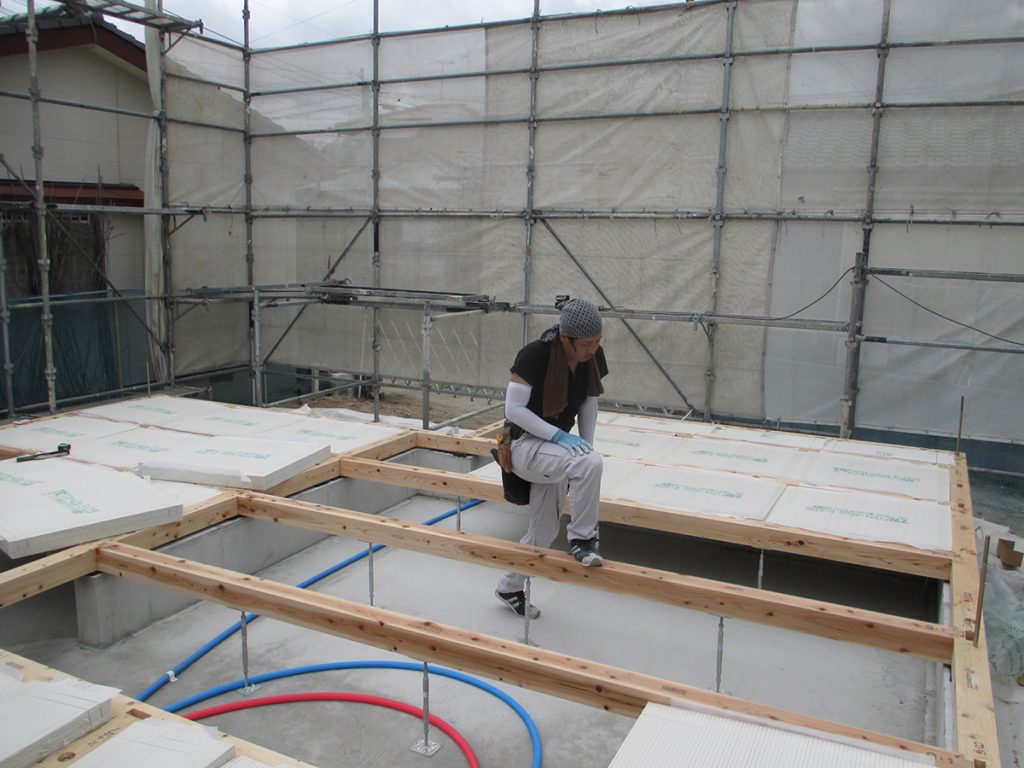 土台を敷いた上に、今度は床下断熱材を貼っていきます。