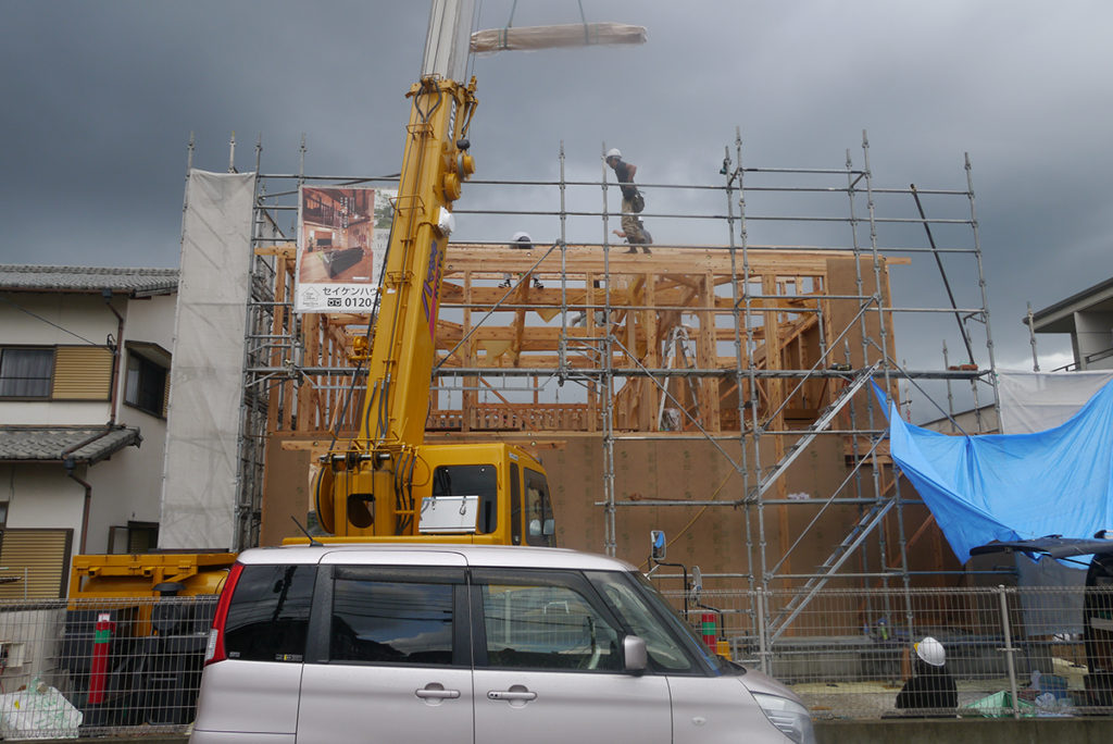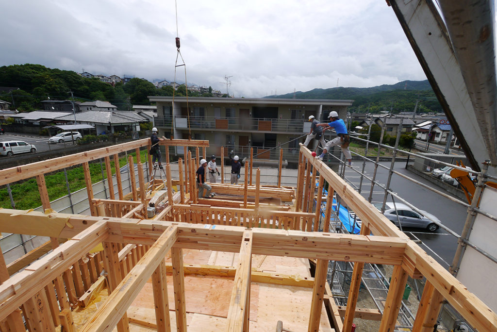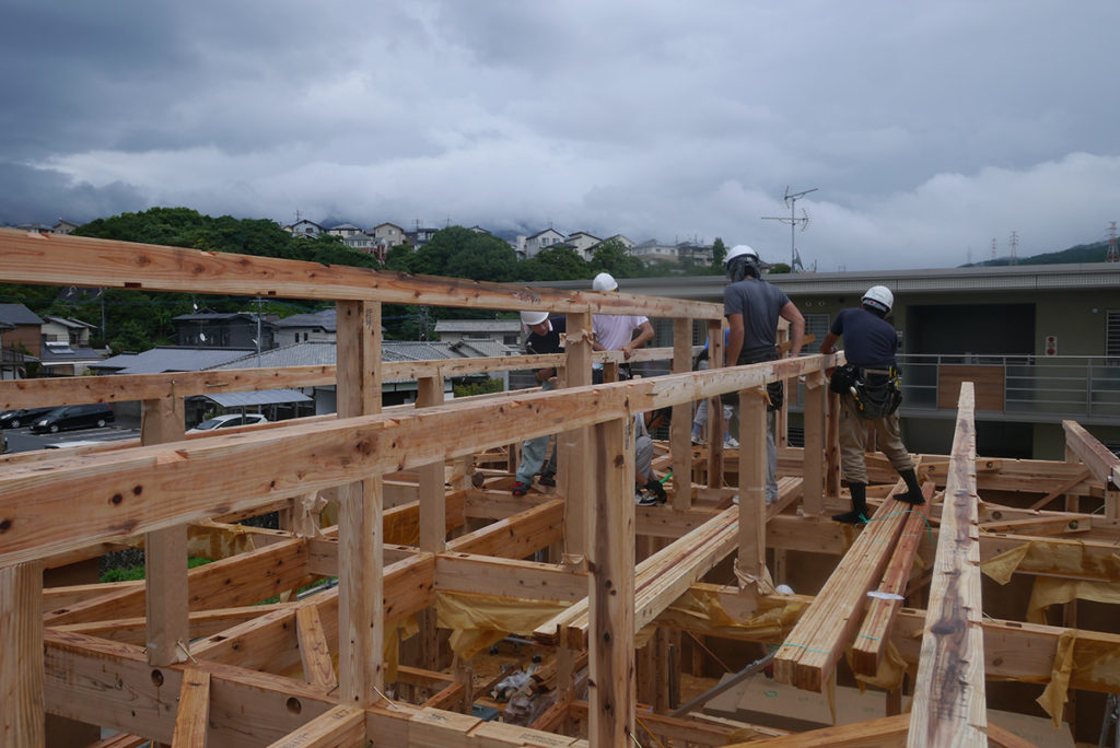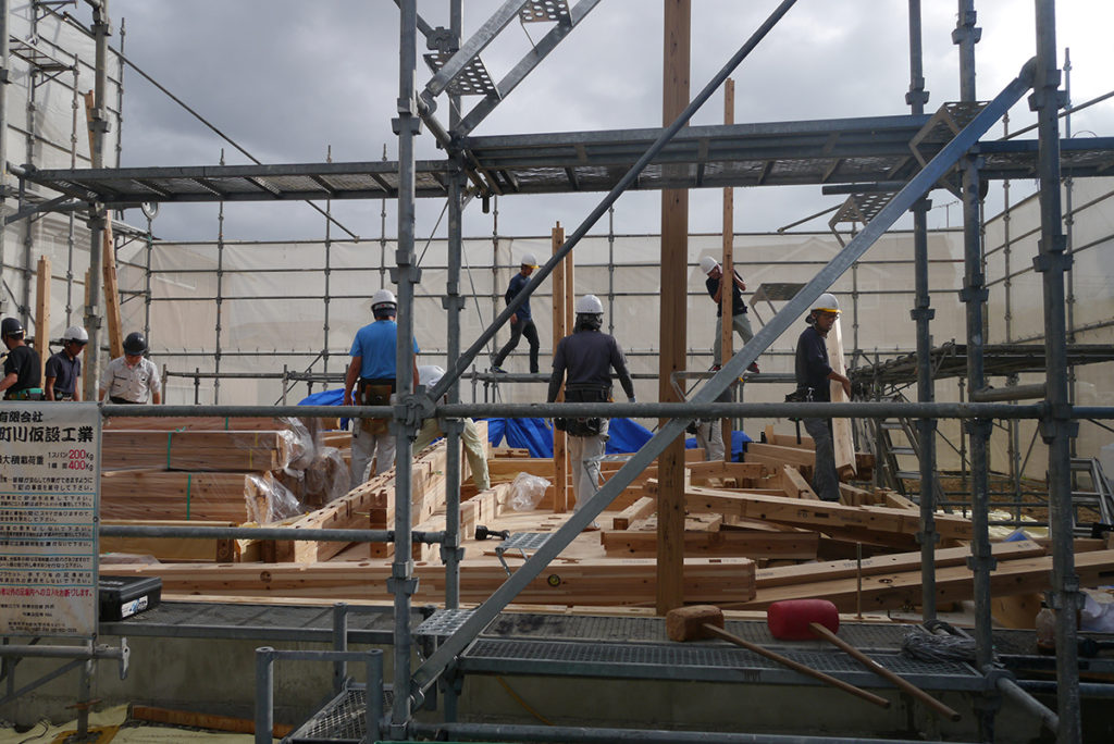 棟梁が中心となり、数人の大工さんと軸組の組み立てを行い一番高い棟木を設置する一連の作業を行います!