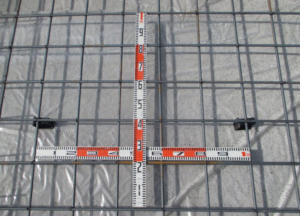 スペーサーブロックを鉄筋の下に敷くことで、鉄筋下側のコンクリートの厚みを確保し、