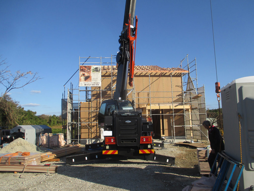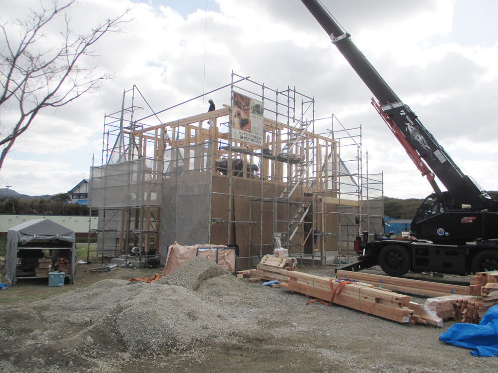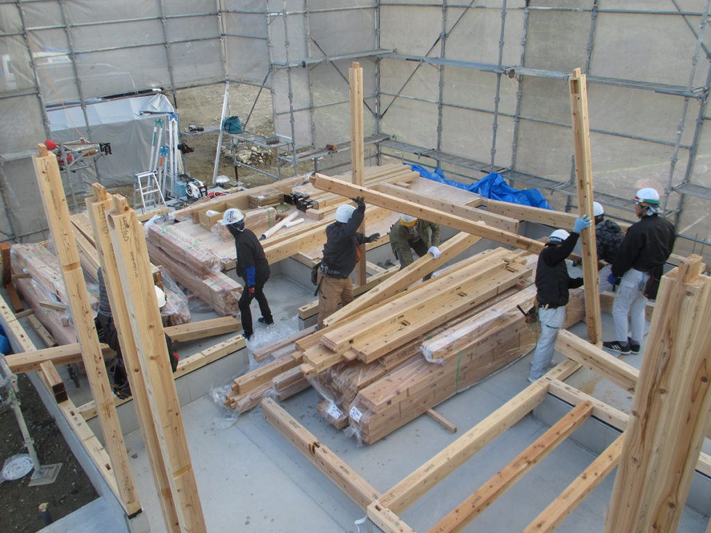 1階の柱を立て、2階の床梁、柱と順番に組み上げます!