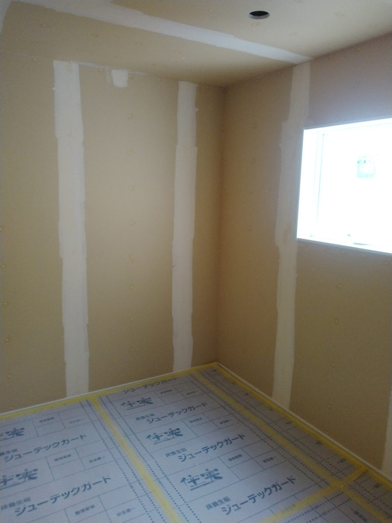 断熱材の上にプラスターボードを打ち付ける工事を行い、壁の土台ができるとクロス工事に入ります!