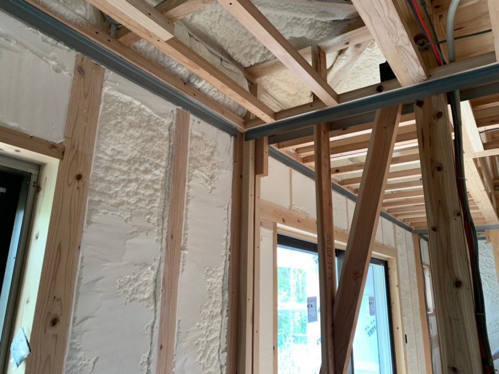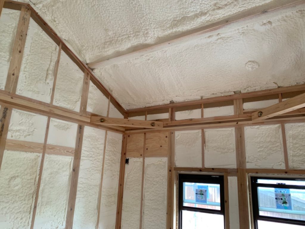 吹き付けの断熱材は、わずかな隙間にも良くいきわたり、夏は室内に熱が伝わりにくく、冬は熱が逃げにくくなります!