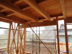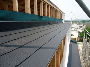 屋根は、土台となる木材→防水シート(棟上げ時写真参照)→屋根材(瓦など)